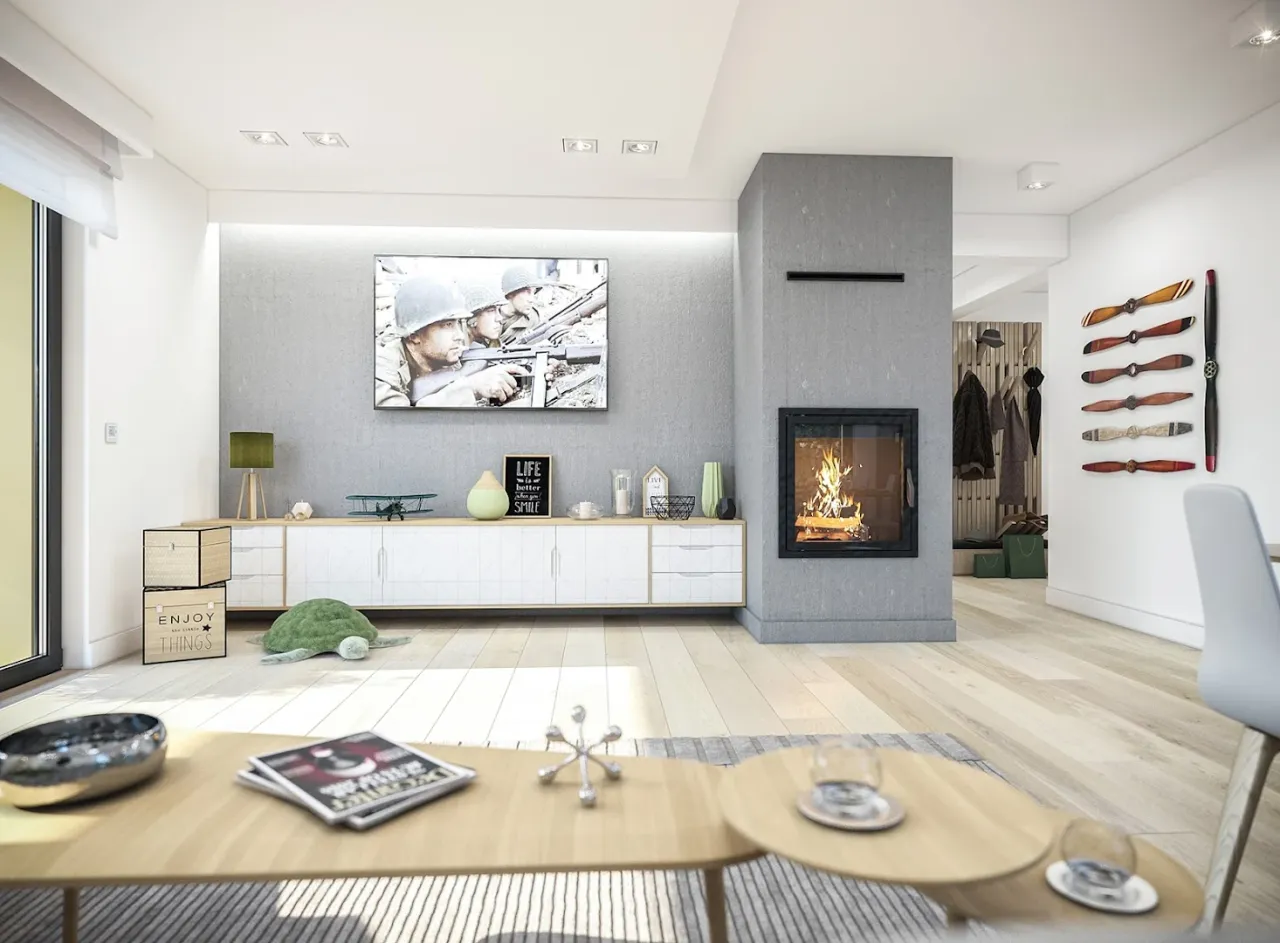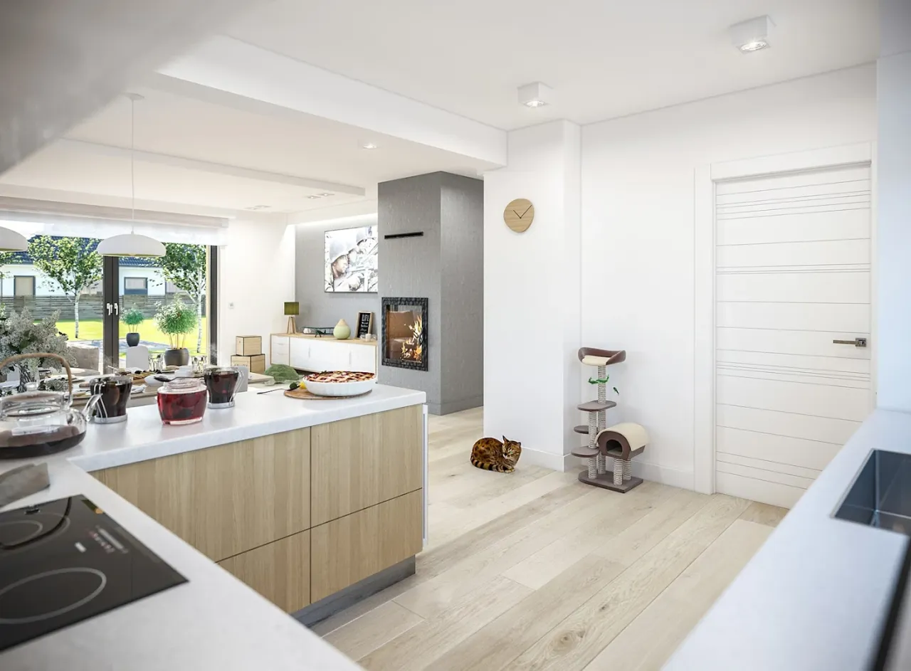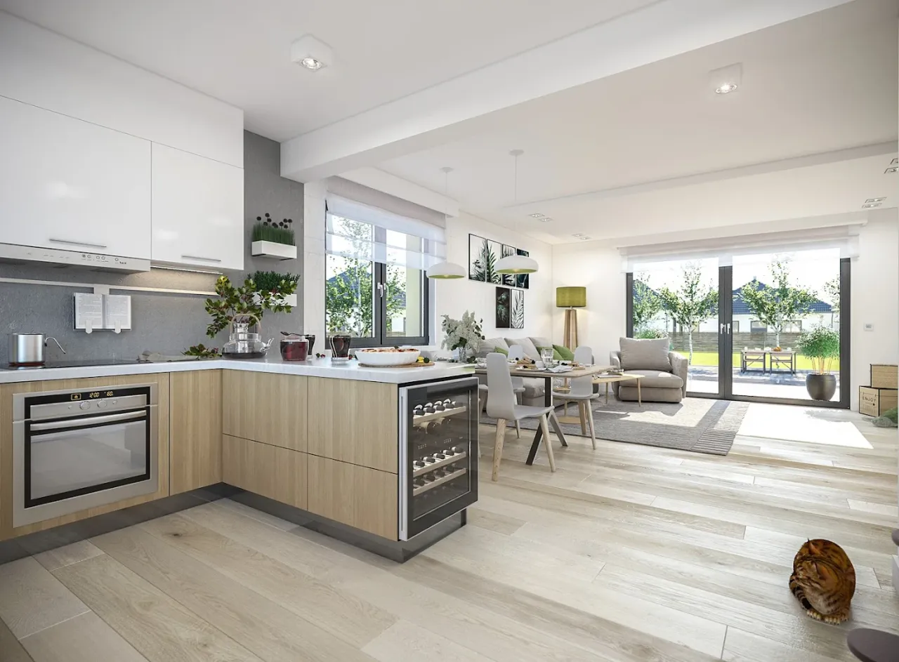 Brak garażu w bryle budynku oznacza maksymalnie wykorzystaną przestrzeń mieszkalną. Przemyślana komunikacja między pomieszczeniami oraz osobna spiżarnia przy kuchni wpływają na codzienną wygodę. Ogrzewanie gazowe lub na paliwo stałe daje elastyczność w wyborze sposobu ogrzewania. Dom wybudowany na podstawie projektu Tracja 5 z łatwością wpasuje się na działce z kalenicą równoległą do drogi, tworząc harmonijną całość z otoczeniem.