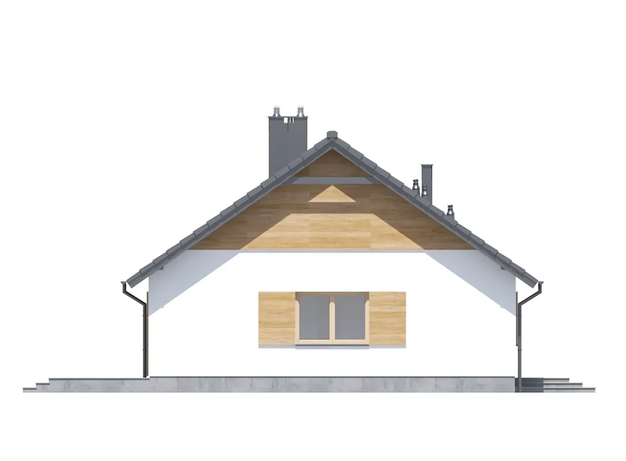 Cztery praktycznie rozplanowane pokoje, funkcjonalna pralnia i duża kotłownia czynią ten projekt domem, w którym z łatwością ułożysz życie całej rodziny. Salon z kominkiem sprzyja wspólnemu spędzaniu czasu, a spiżarnia przylegająca do kuchni pozwala zachować porządek. Kalenica równoległa do drogi ułatwia posadowienie budynku na wąskiej lub nietypowej działce.