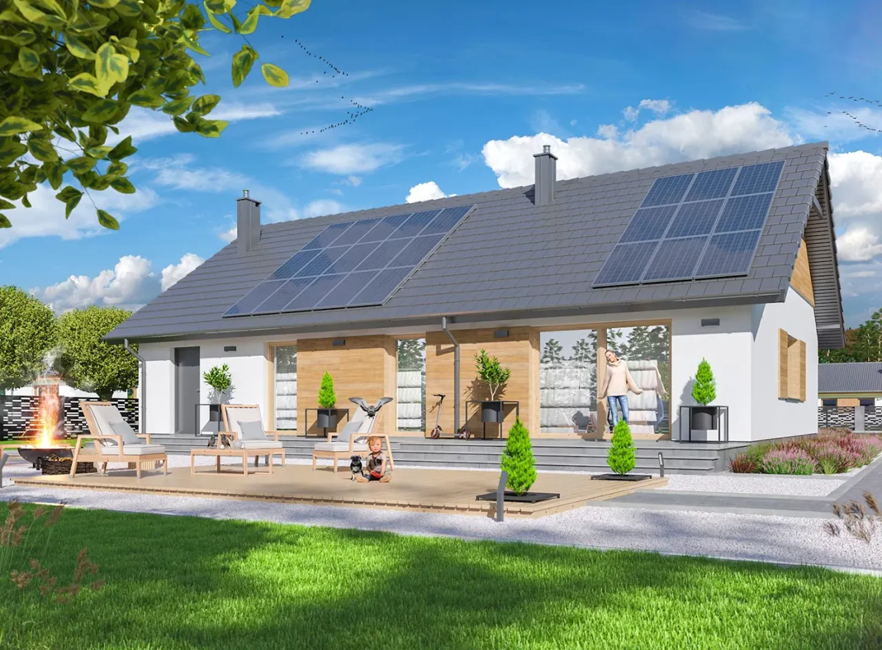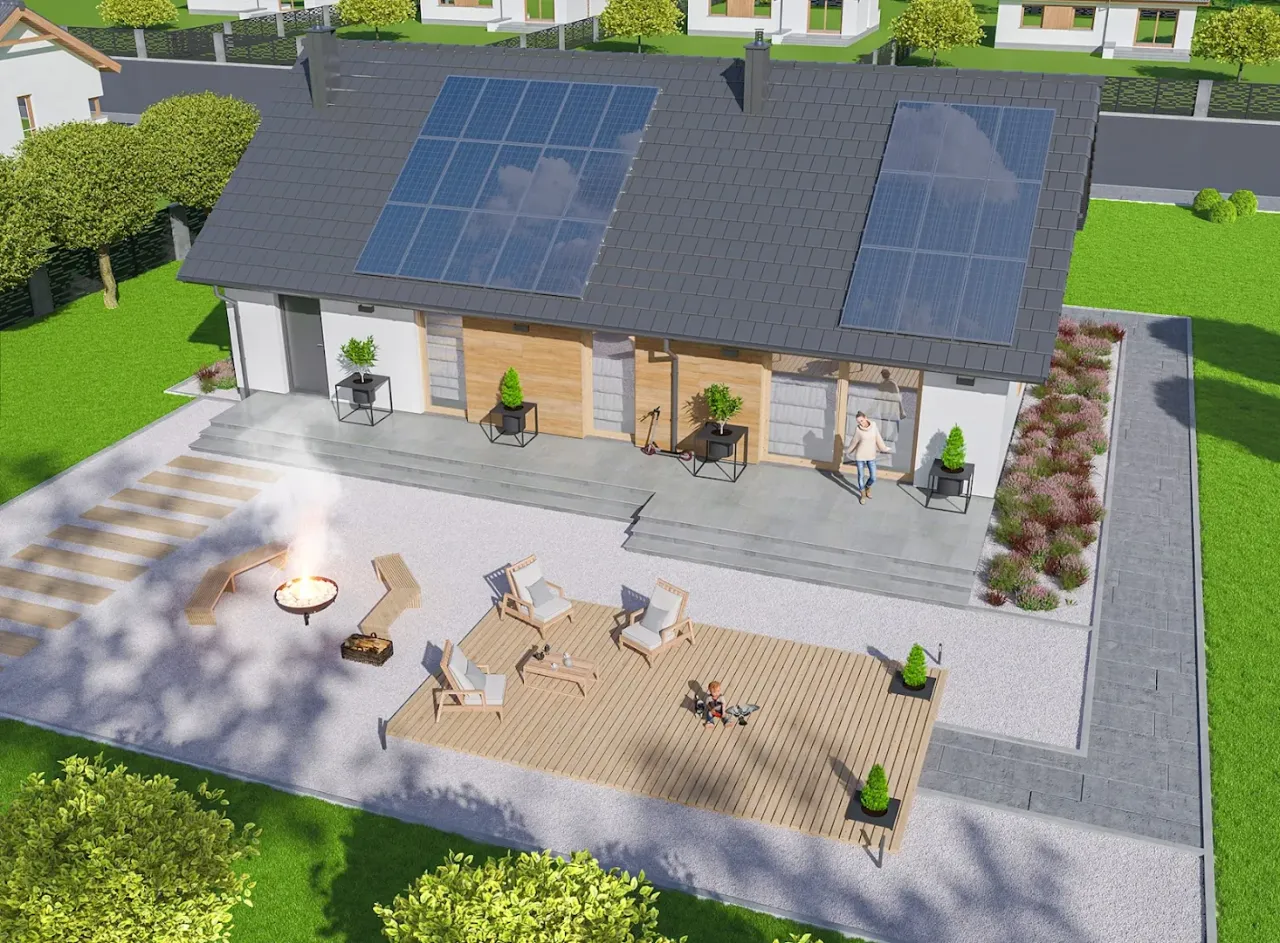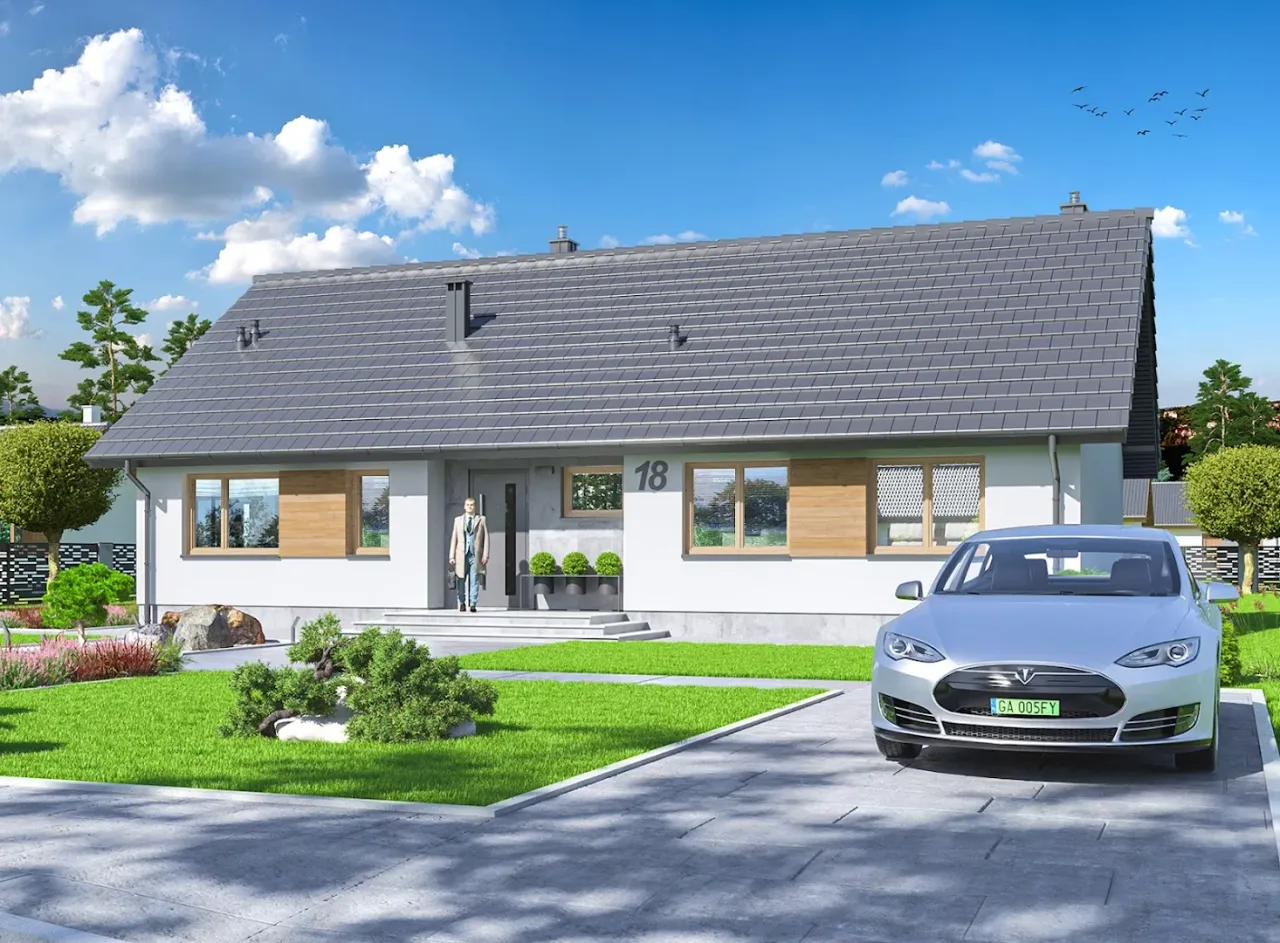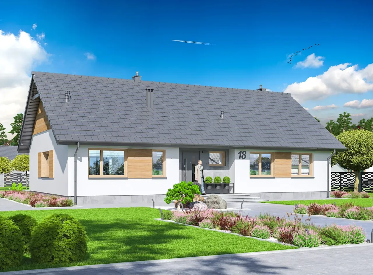 Dom wybudowany na podstawie projektu Tracja 6 Energo to propozycja dla osób ceniących niskie koszty użytkowania i szybkie tempo realizacji. Parterowa konstrukcja, kalenica równoległa do drogi i duża kotłownia pozwalają na łatwe dopasowanie do wielu działek, także w zabudowie podmiejskiej.
