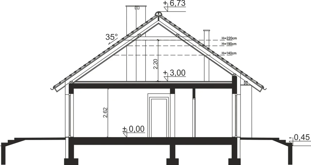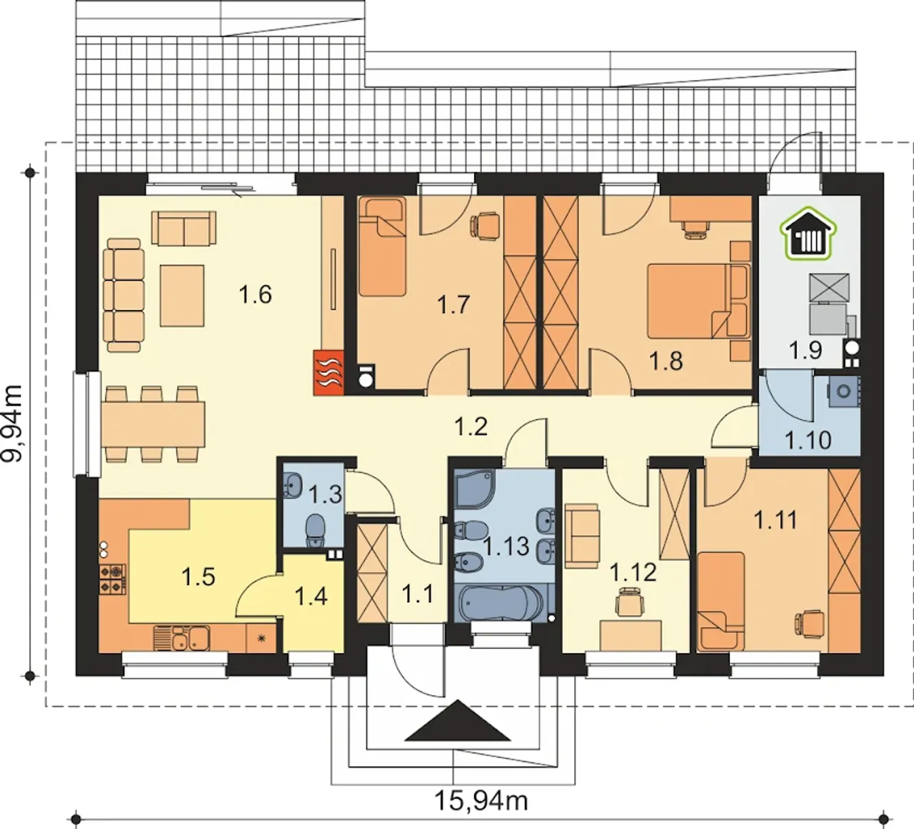 Budynek oparto na solidnych fundamentach betonowych, z wykorzystaniem stropu gęstożebrowego TERIVA oraz lekkiej, a zarazem wytrzymałej drewnianej więźby dachowej. Pokrycie z dachówki cementowej lub ceramicznej dodaje domowi ponadczasowego uroku. Wewnątrz znajdziesz dużą kotłownię - bez problemu zmieścisz nowoczesną pompę ciepła, centralne ogrzewanie podłogowe oraz alternatywnie piec na biomasę. Do projektu dodawany jest gratis gotowy schemat instalacji fotowoltaicznej, by Twój dom był maksymalnie energooszczędny.
