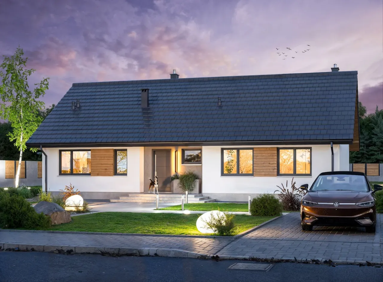 Pakiet energooszczędny, w skład którego wchodzi: ogrzewanie pompą ciepła, projekt ogrzewania podłogowego, projekt instalacji fotowoltaicznej i charakterystyka energetyczna.