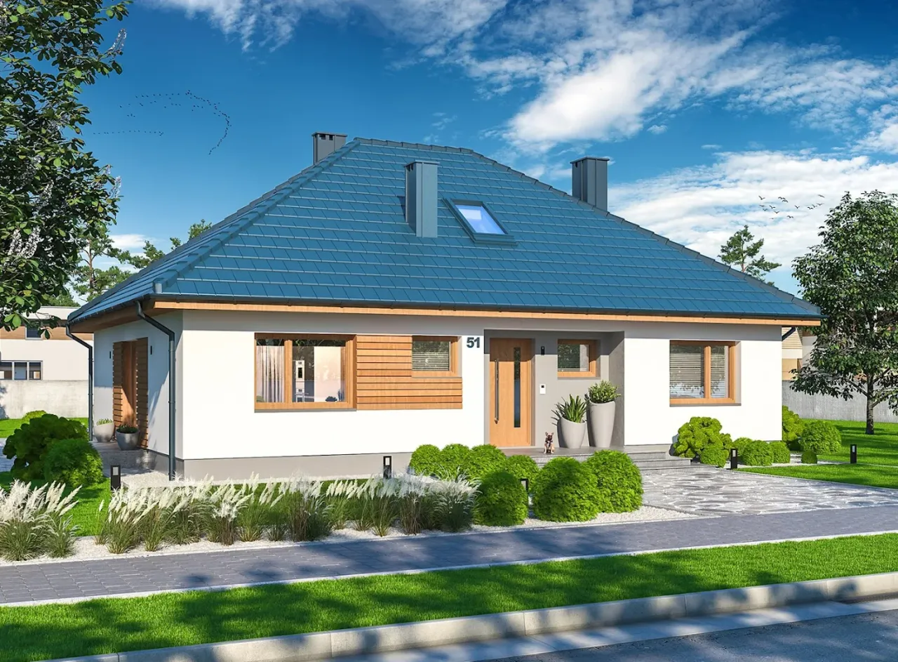 Ściany z betonu komórkowego oraz gruba warstwa styropianu skutecznie chronią przez cały rok, pomagając ograniczać koszty ogrzewania. Wielospadowy dach pokryty dachówką ceramiczną lub cementową to nie tylko estetyka, ale także trwałość i odporność na zmienne warunki pogodowe. Zarówno wentylacja tradycyjna, jak i opcjonalna rekuperacja, pozwalają dopasować dom do indywidualnych preferencji i oczekiwań inwestora.
