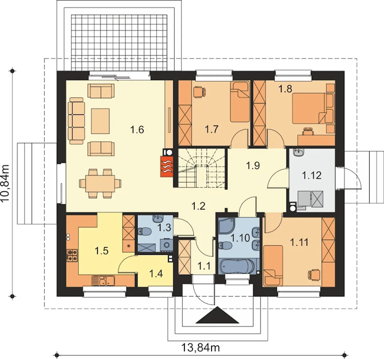 Projekt domu jednorodzinnego Tracja 8 zaprojektowano z myślą o komforcie i praktyczności. Rozwiązania takie jak parterowy układ, duża kotłownia oraz funkcjonalna spiżarnia ułatwiają codzienne użytkowanie. Kominek w centralnej części domu pozwala stworzyć wyjątkową atmosferę, sprzyjającą rodzinnym spotkaniom i odpoczynkowi.
