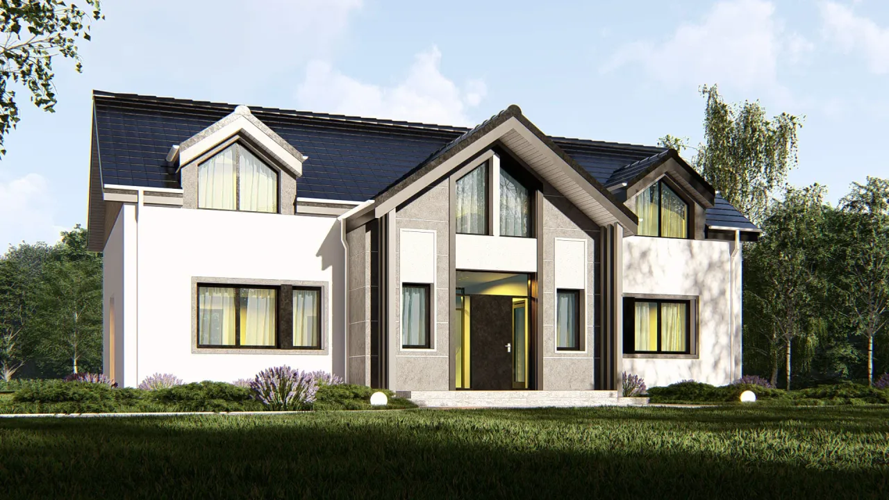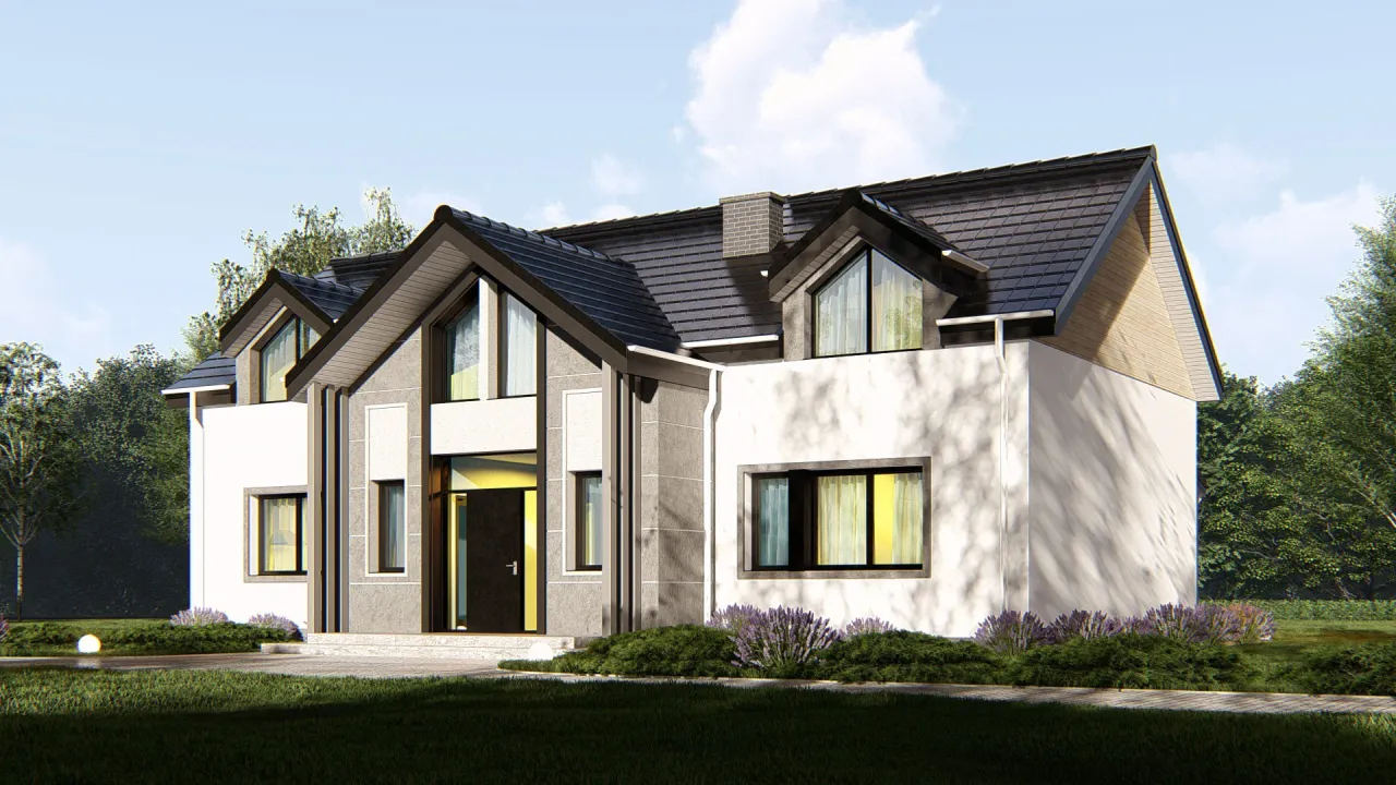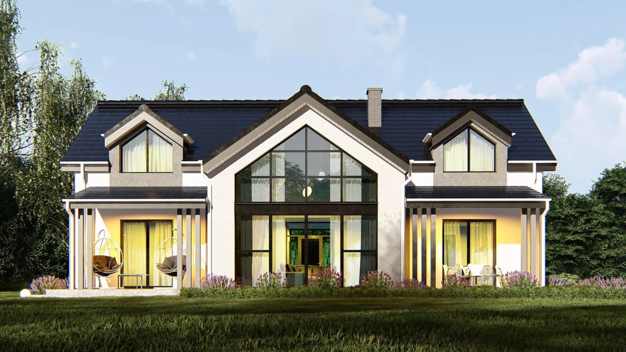 - Nowoczesny styl budynku: Współczesna linia elewacji i wielospadowy dach podkreślają reprezentacyjny charakter domu i pasują do prestiżowych osiedli oraz działek podmiejskich.