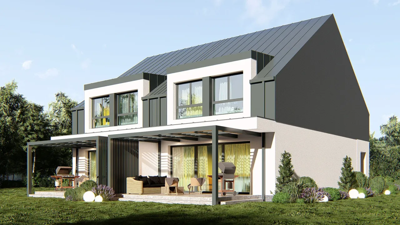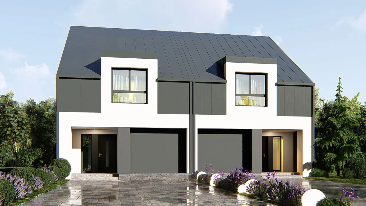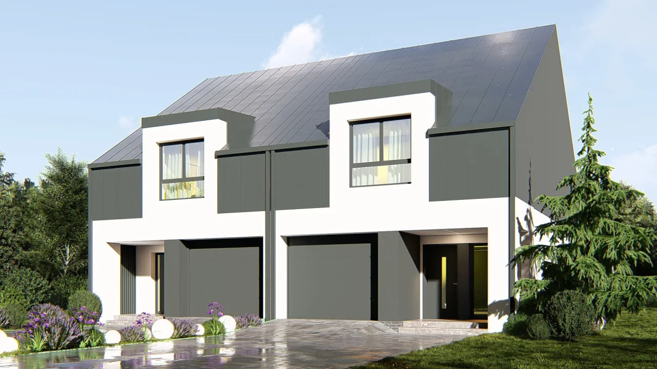 Projekt domu UA433 prezentuje nowoczesny dom bliźniaczy z poddaszem użytkowym, idealny dla dwóch rodzin szukających funkcjonalnej i estetycznej zabudowy. Przemyślany układ oraz racjonalne rozwiązania konstrukcyjne przekładają się na rozsądne koszty budowy i eksploatacji.