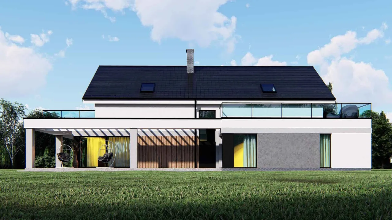 Projekt domu UA449 to propozycja dla inwestorów, którzy cenią nowoczesną estetykę, funkcjonalny układ i rozsądne koszty budowy. Parter z poddaszem użytkowym tworzy przejrzystą, rodzinną przestrzeń, a nowoczesny charakter bryły dobrze wpisuje się w obecne trendy zabudowy jednorodzinnej.