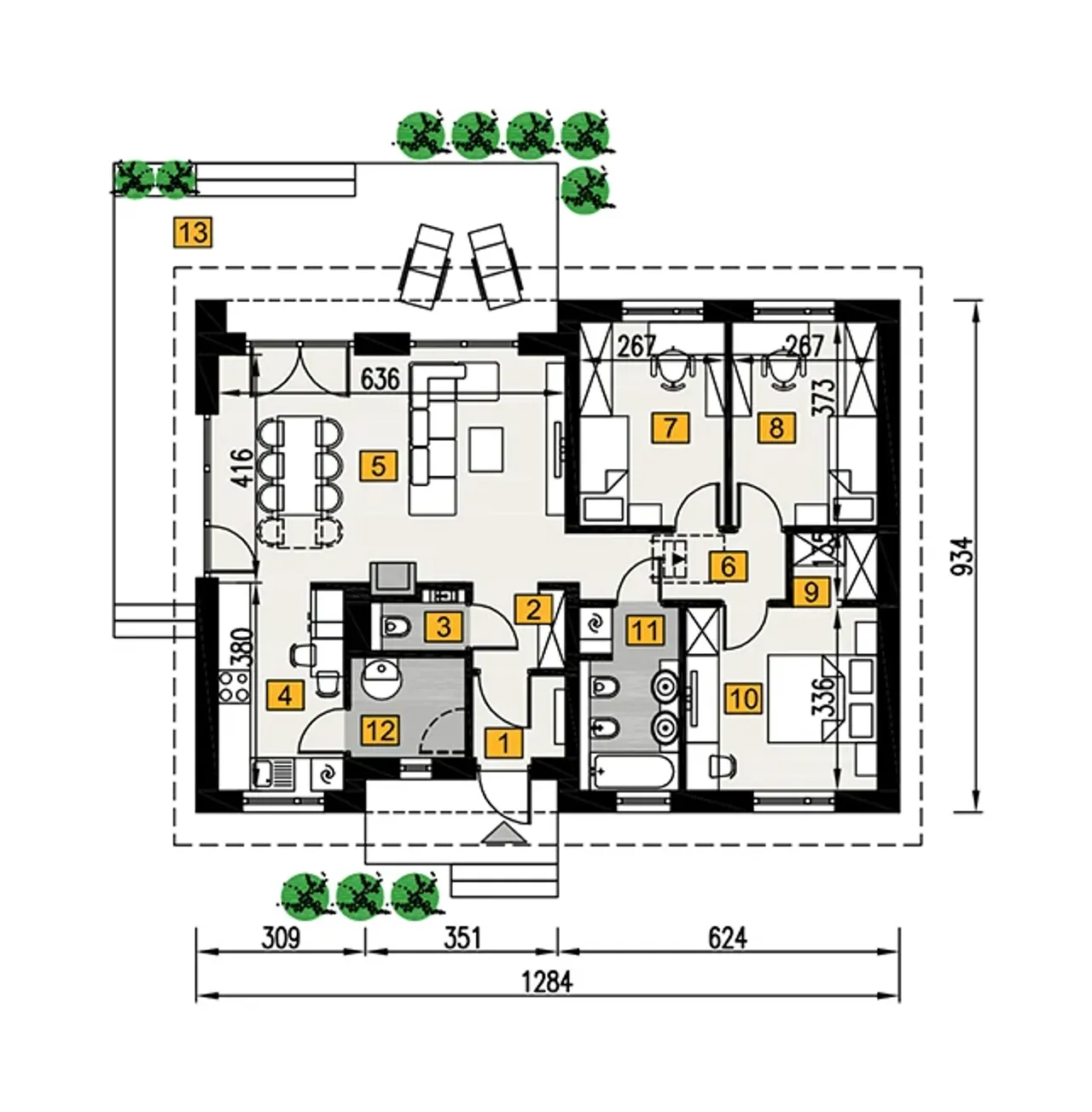 Wypełnij formularz i otrzymaj rysunki w pdf z dokładnymi wymiarami budynku i pomieszczeń (długość, szerokość, wysokość) dla projektu Umiarkowany (aranżacja 1) - A103+AR1