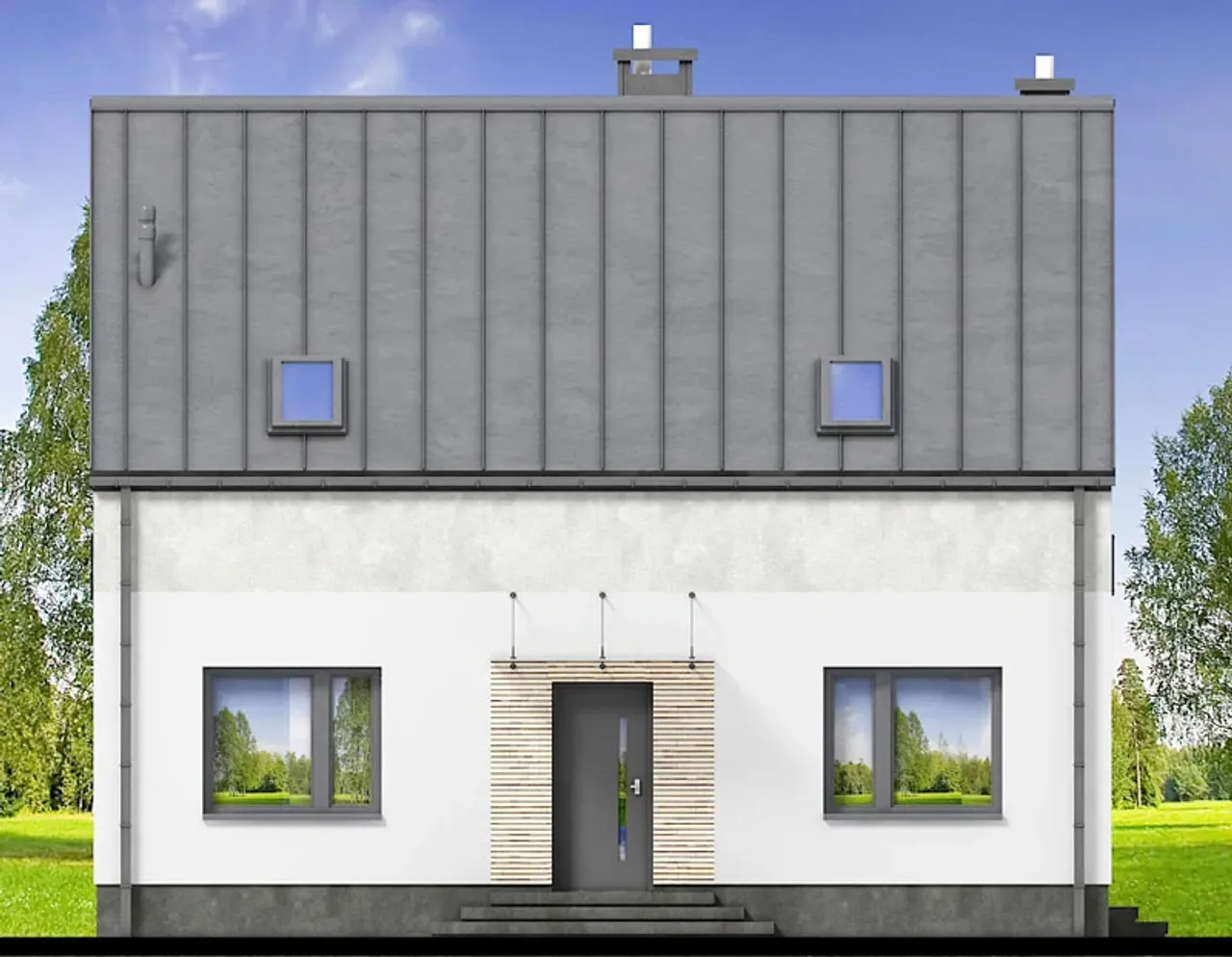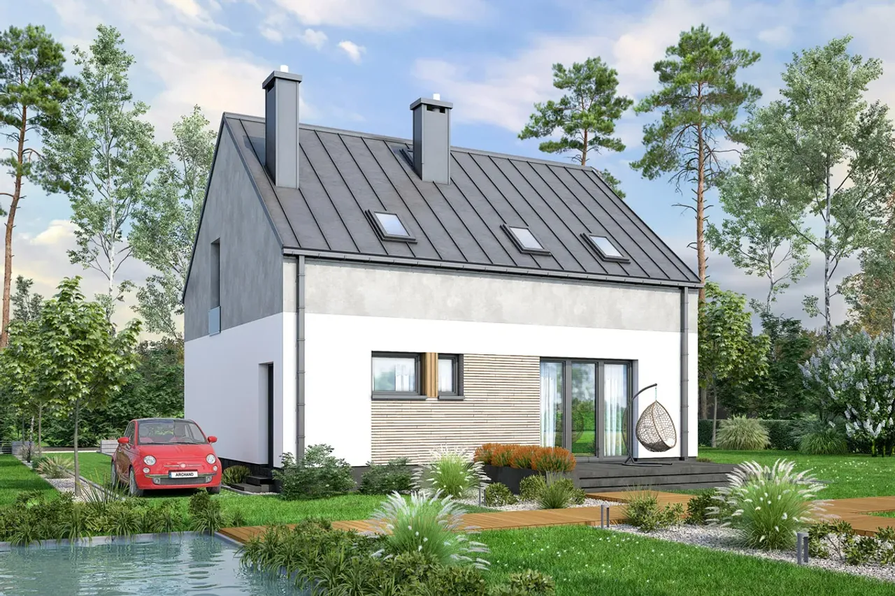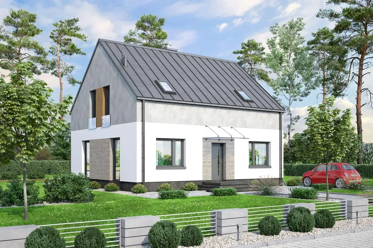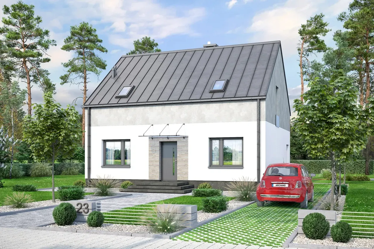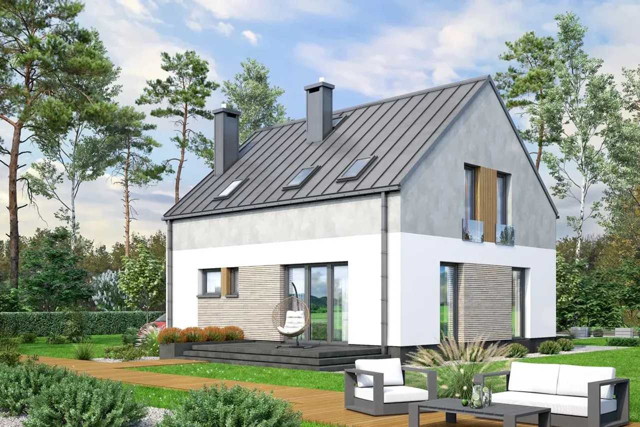 Odkryj projekt domu jednorodzinnego, który łączy nowoczesną estetykę z funkcjonalnością - idealne rozwiązanie dla rodzin ceniących przestrzeń, wygodę i energooszczędne technologie. To dom parterowy z poddaszem użytkowym, pięcioma pokojami i przytulnym kominkiem, stworzony z myślą o maksymalnym komforcie na co dzień.