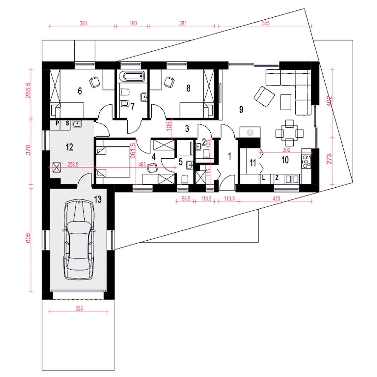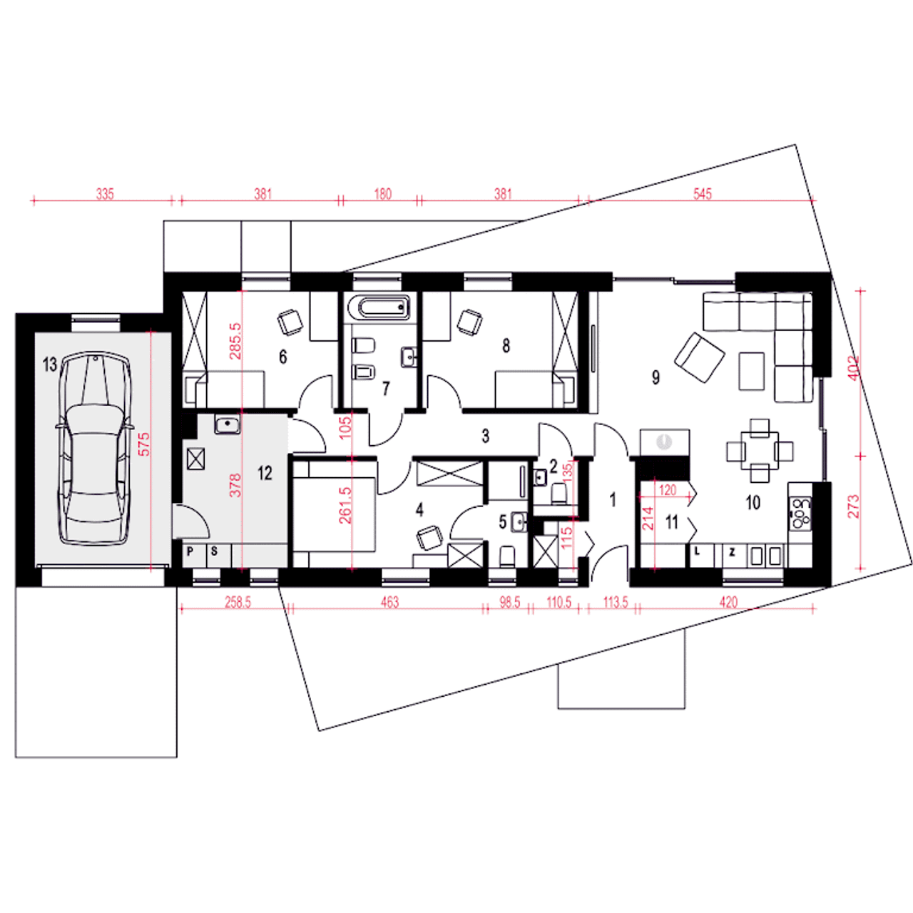 Wypełnij formularz i otrzymaj rysunki w pdf z dokładnymi wymiarami budynku i pomieszczeń (długość, szerokość, wysokość) dla projektu Żurawinka z garażem 1-st. A