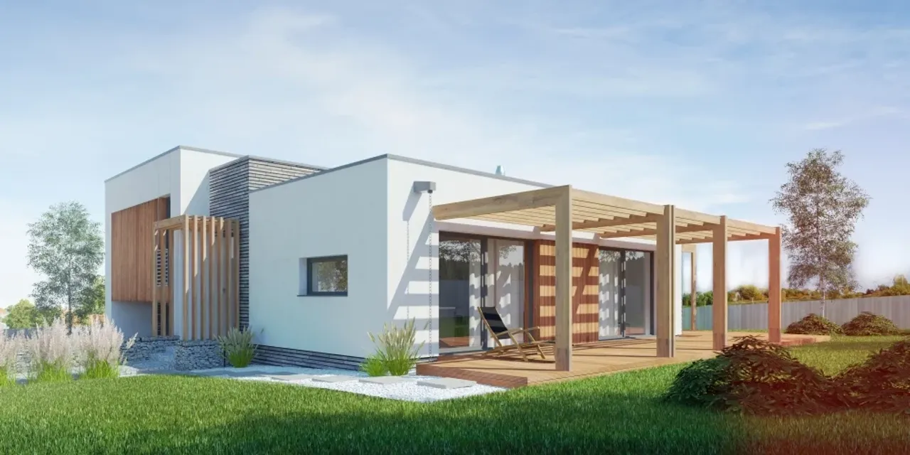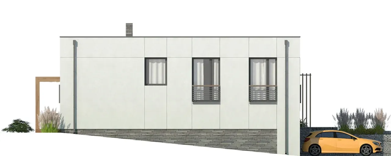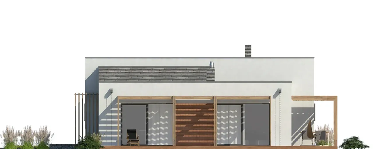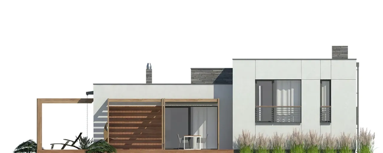 Virdis I PG2 to parterowy dom całoroczny o zwartej bryle, z minimalistycznym stropodachem pokrytym nowoczesną membraną dachową. Przemyślana konstrukcja stropodachu gęstożebrowego nad półpiętrem oraz żelbetowy strop nad parterem skutecznie zabezpieczają przed utratą ciepła i hałasem.