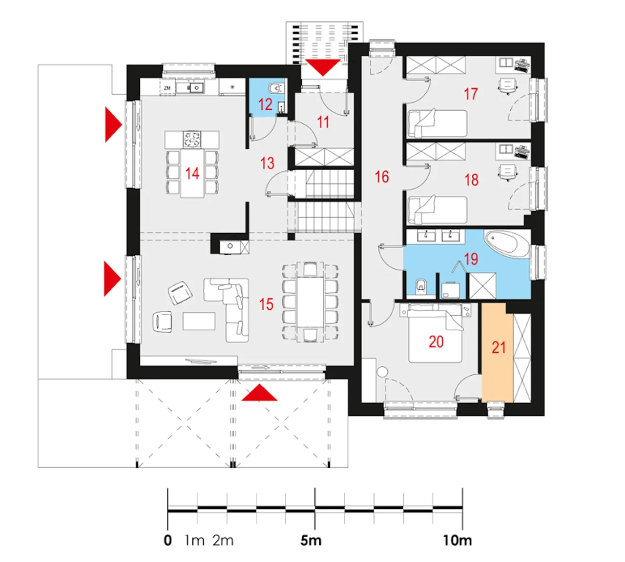 Cztery ustawne pokoje sprzyjają urządzeniu przestronnych sypialni, gabinetu lub pokoju rekreacyjnego. Drewniana pergola pozwala cieszyć się chwilami relaksu na tarasie przez cały rok. Zastosowane okna i drzwi PVC z roletami zewnętrznymi oraz bramą garażową segmentową ułatwiają codzienność i podnoszą bezpieczeństwo.