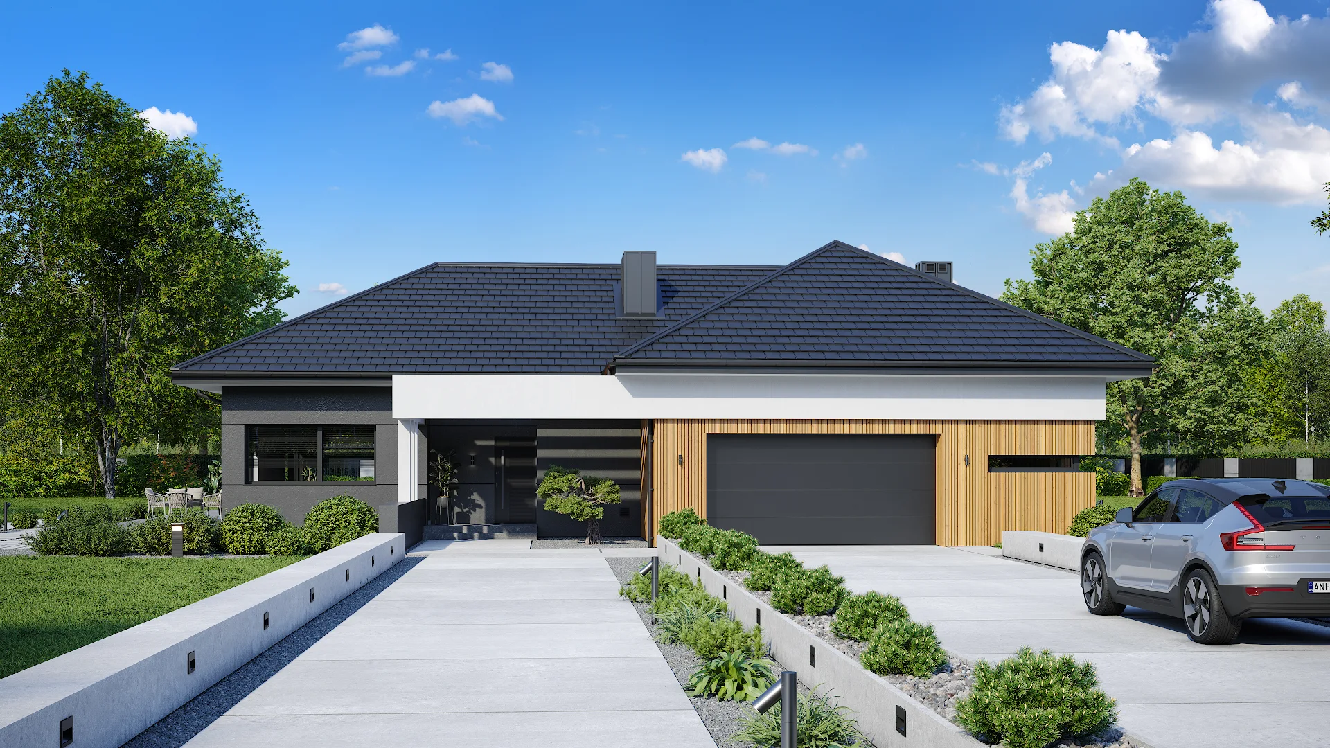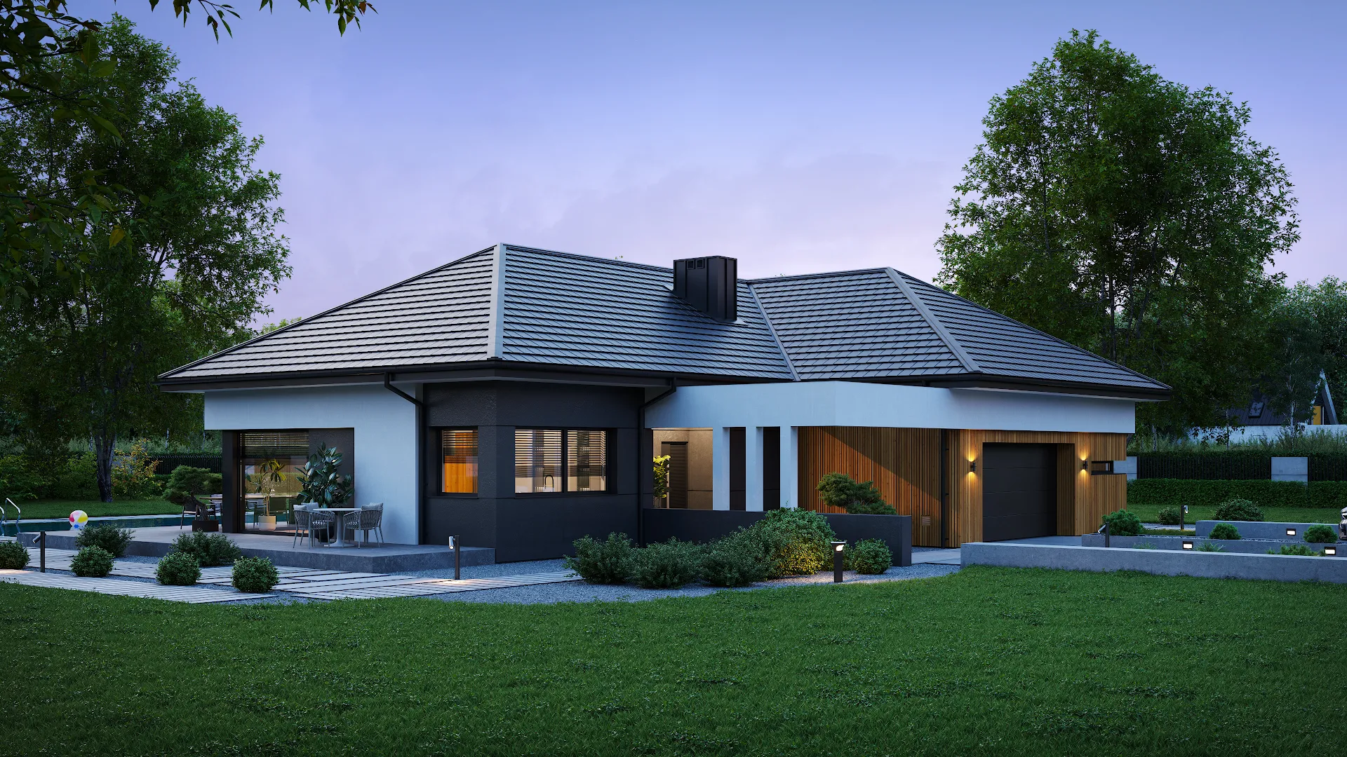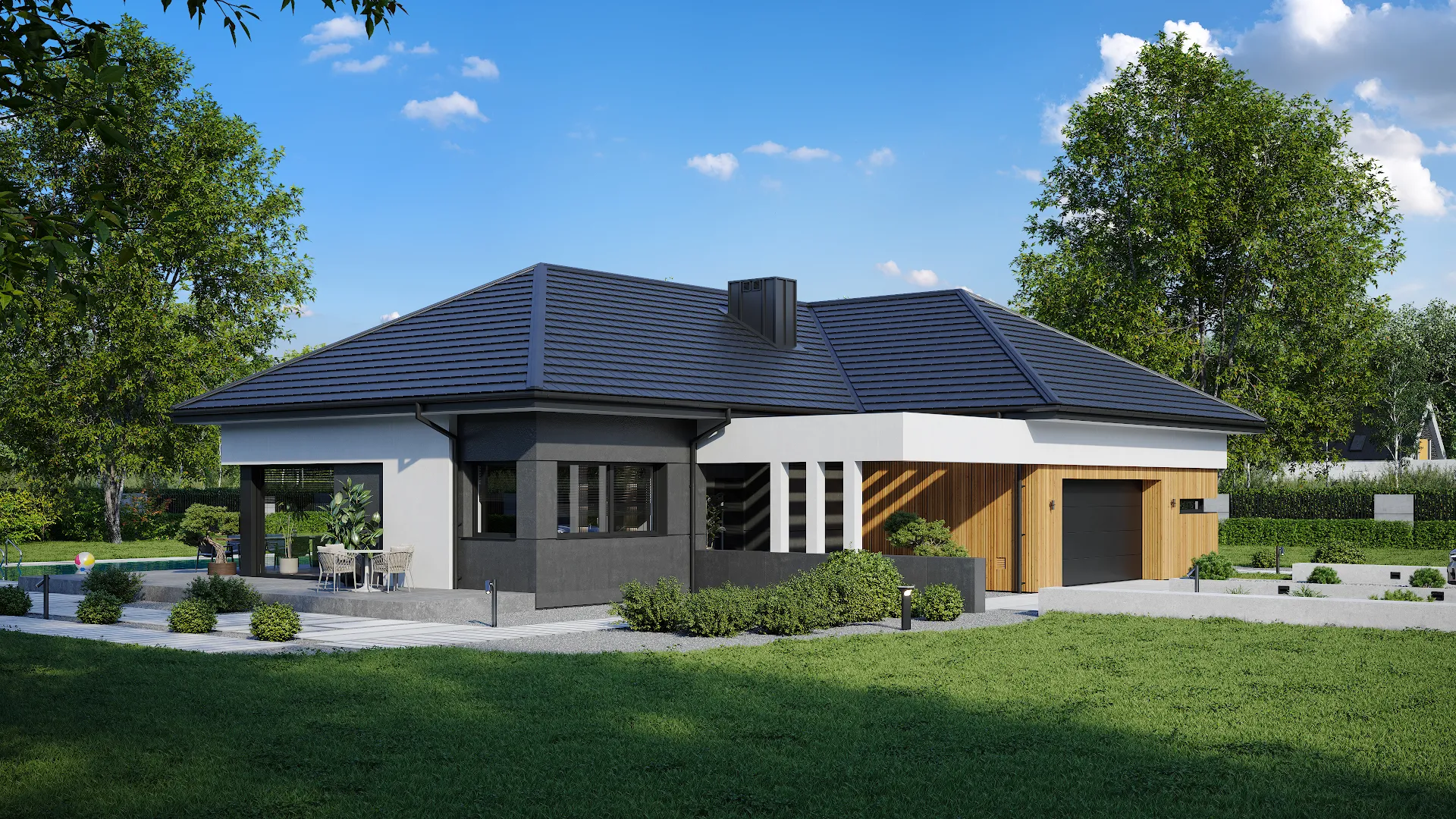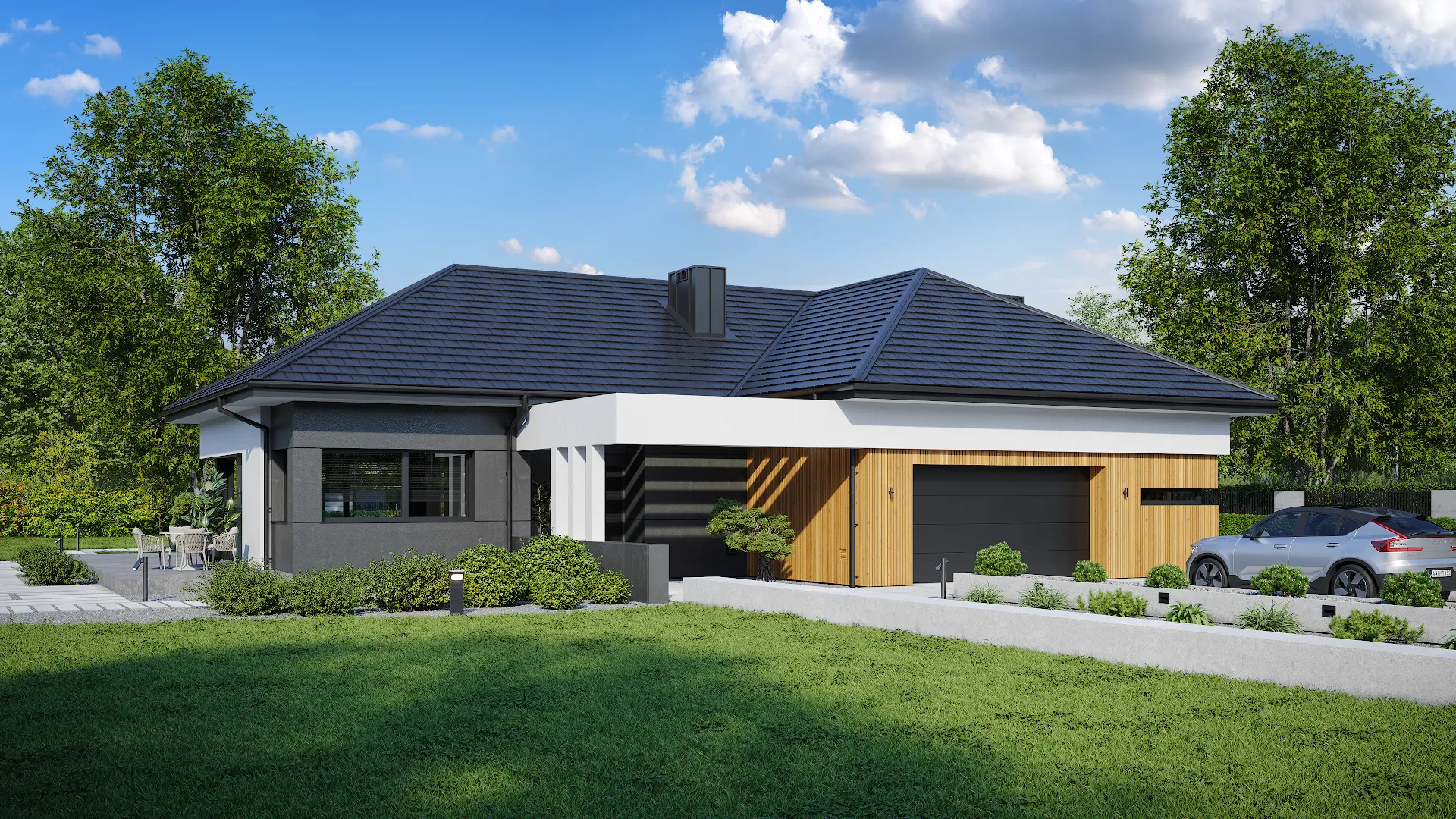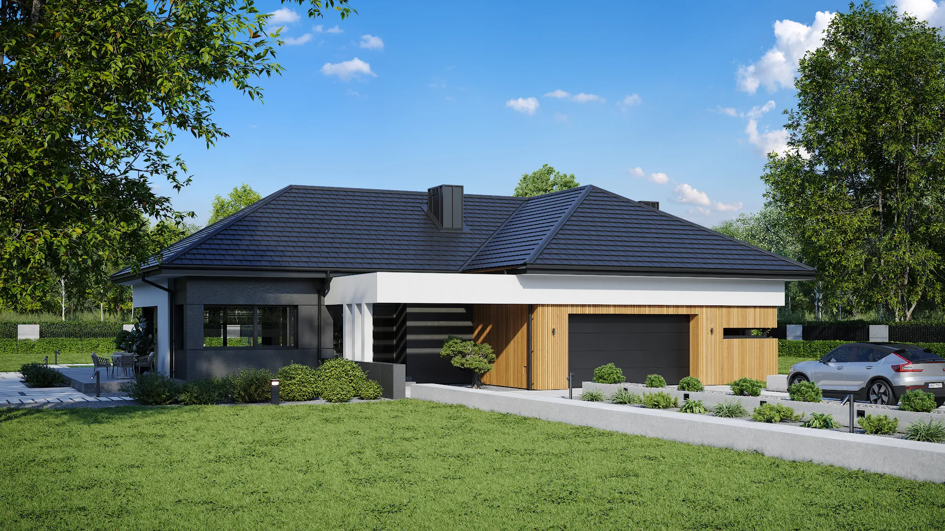- Elewacje tynk silikonowy w kolrze białym i grafitowym, drewno elewacyjne.