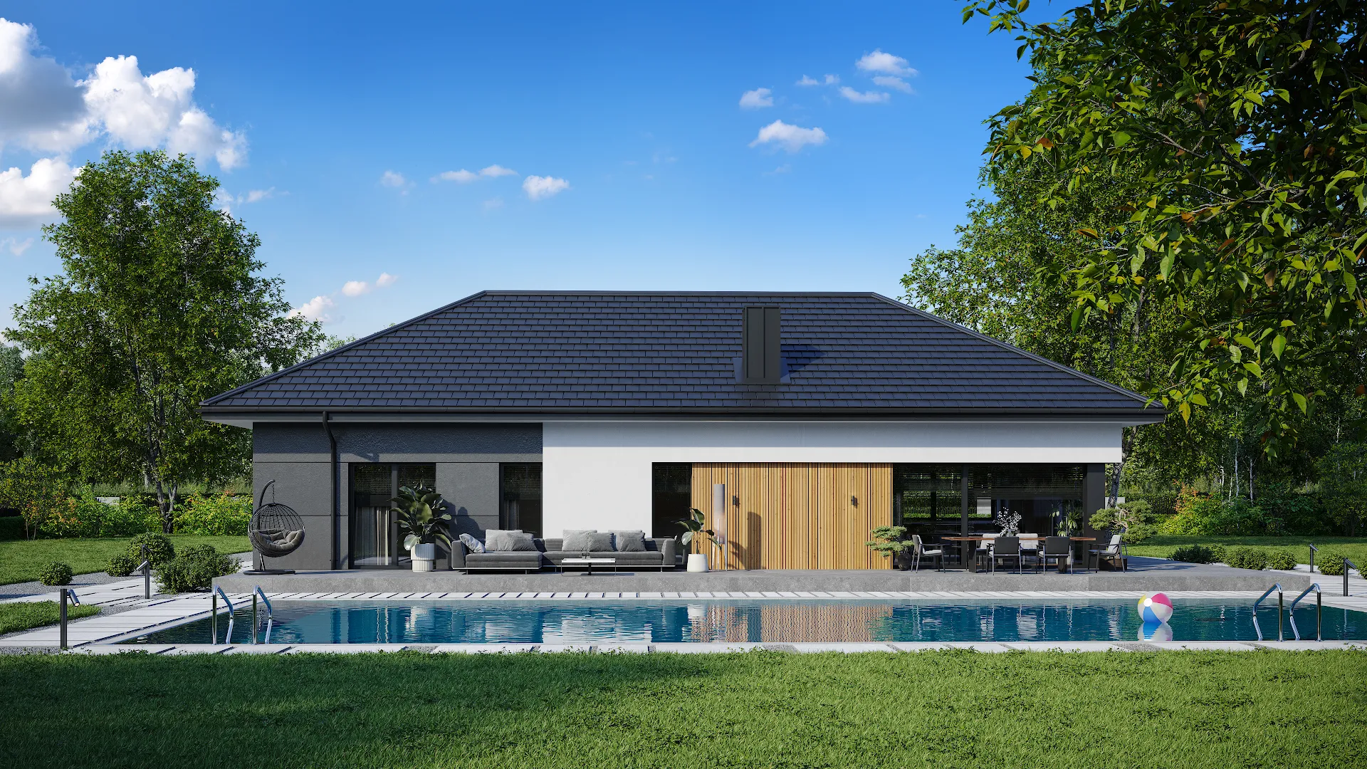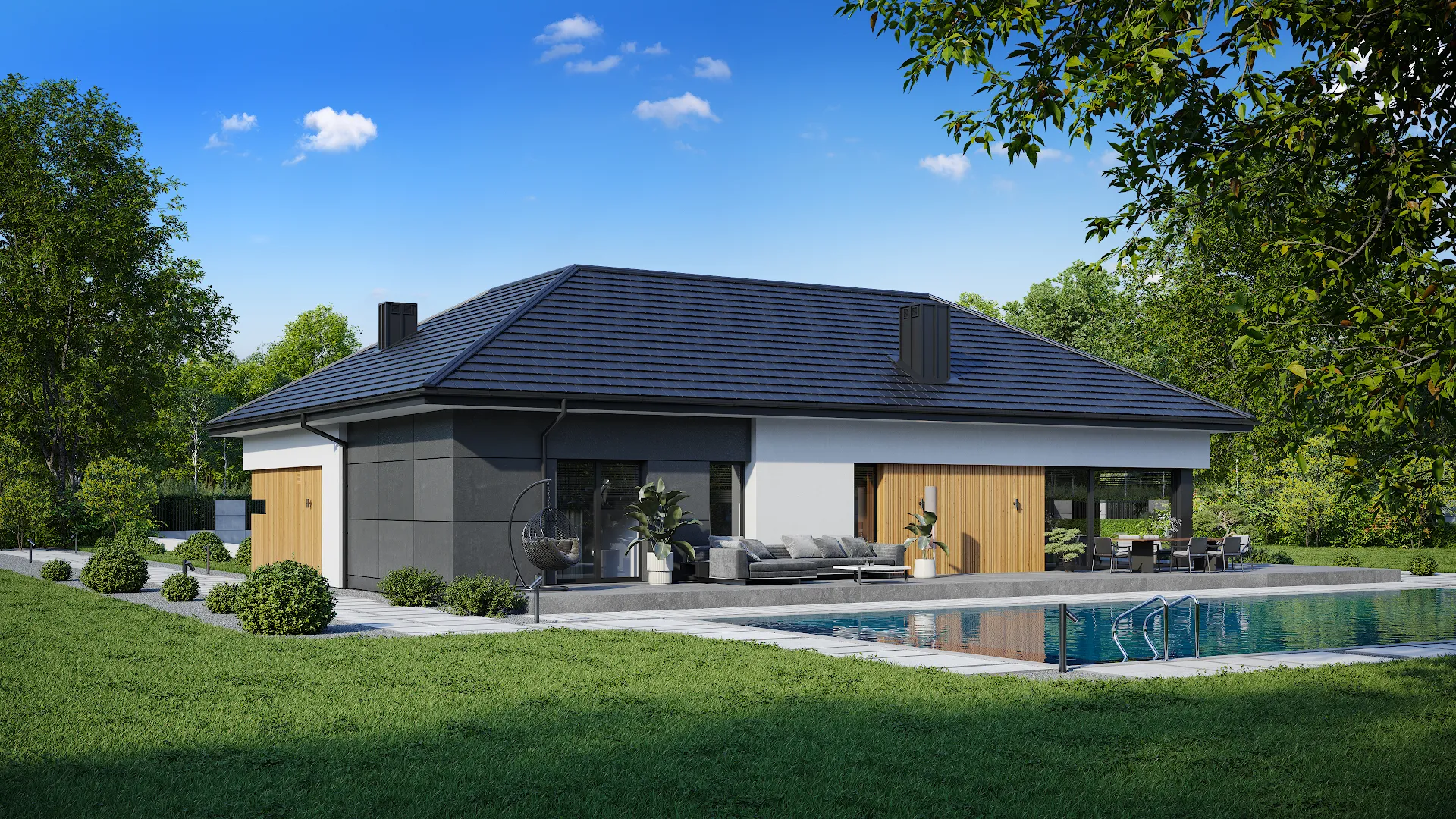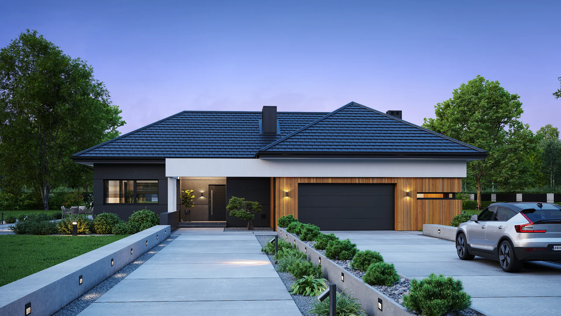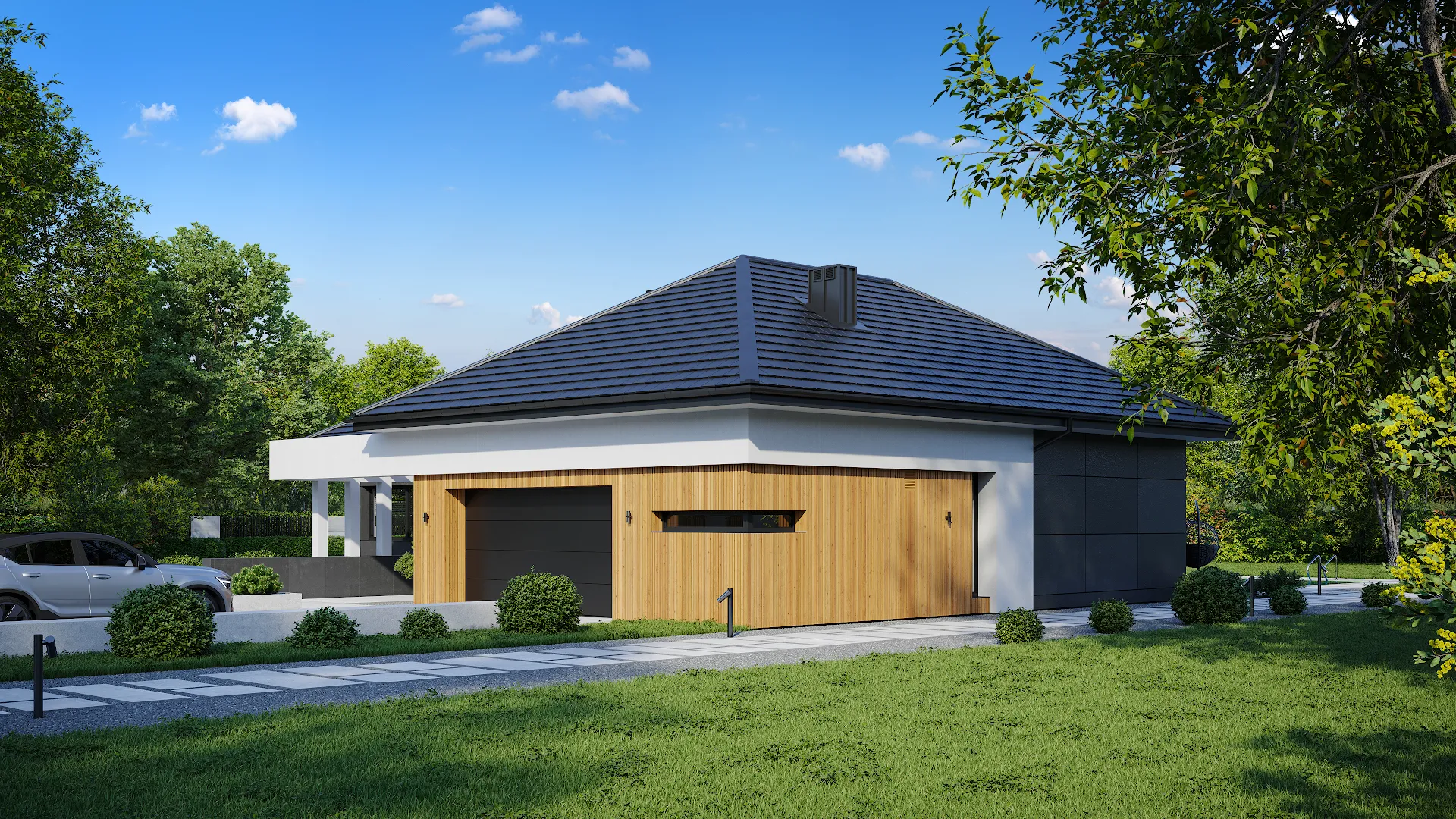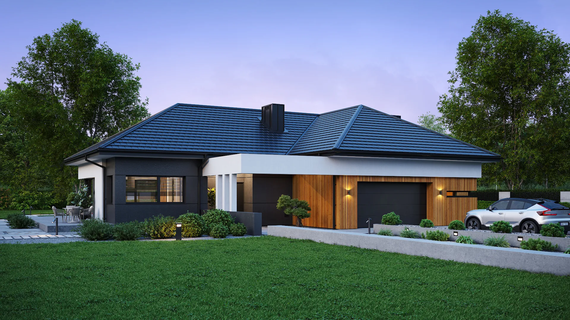 - Elewacje tynk silikonowy w kolrze białym i grafitowym, drewno elewacyjne.