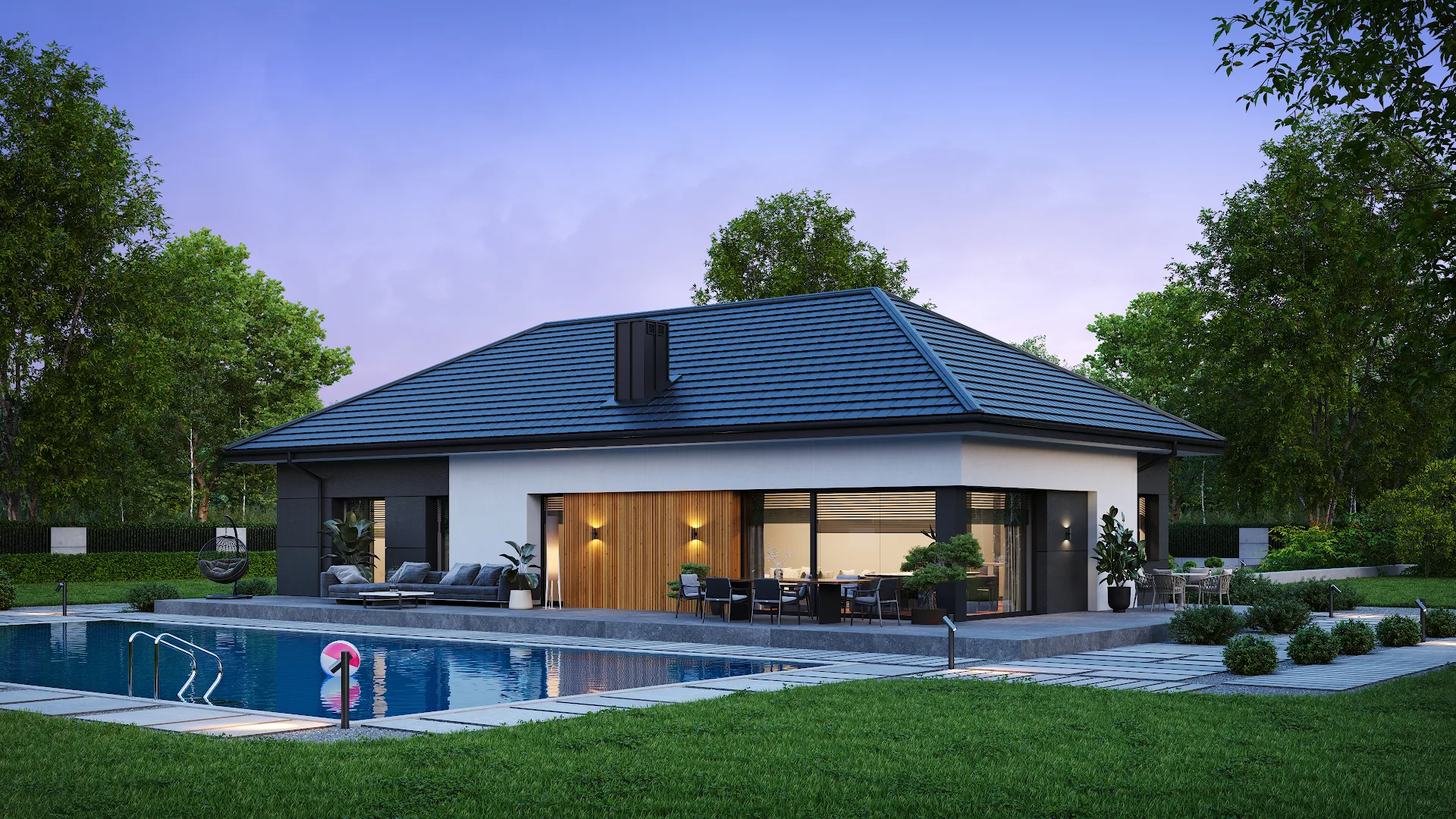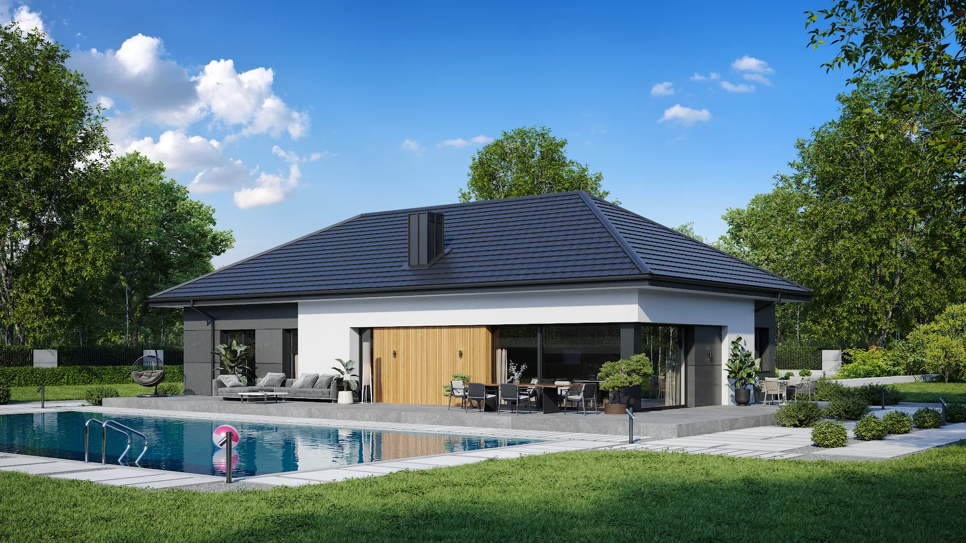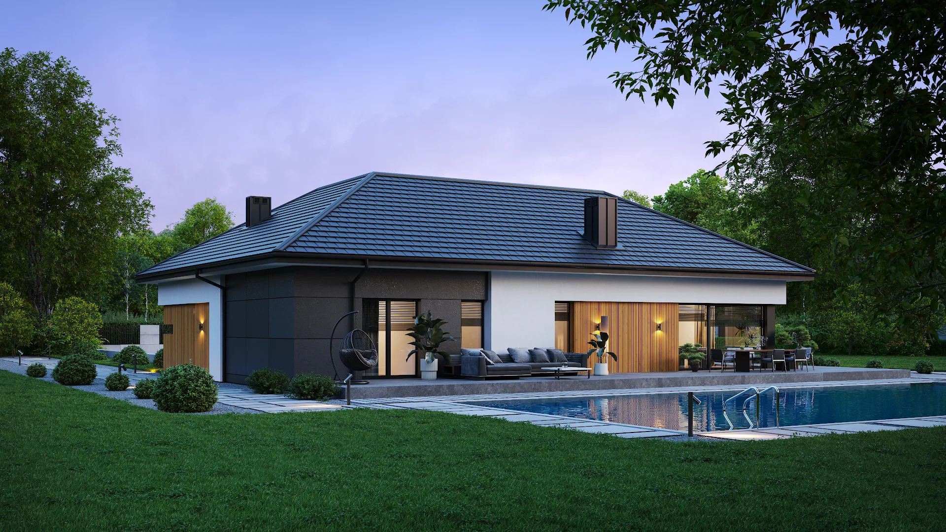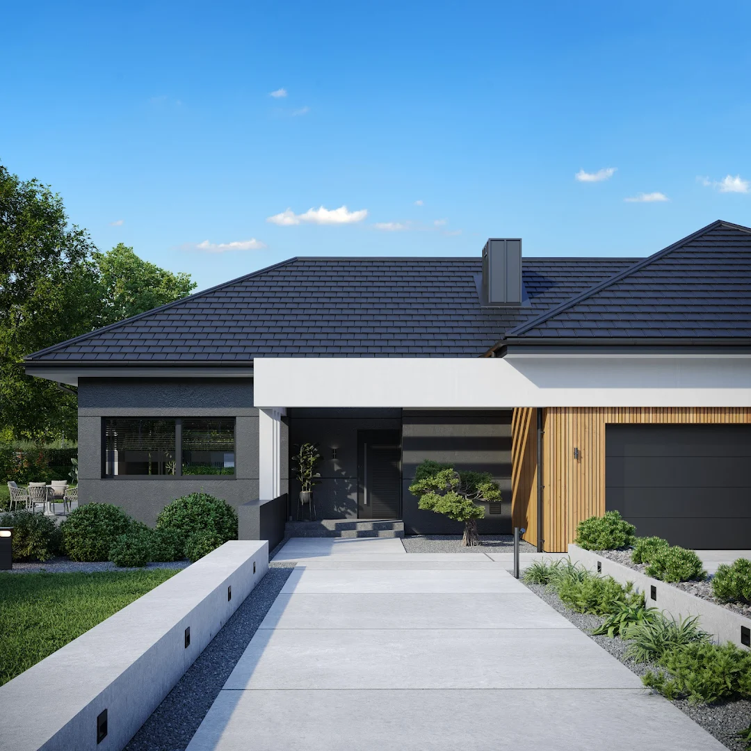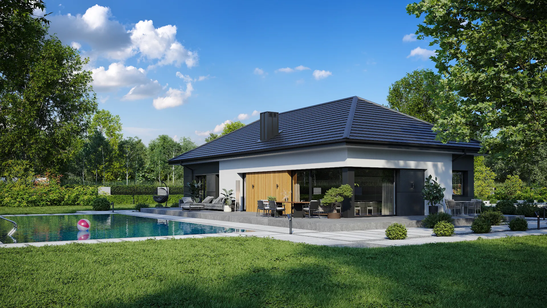 - Elewacje tynk silikonowy w kolrze białym i grafitowym, drewno elewacyjne.