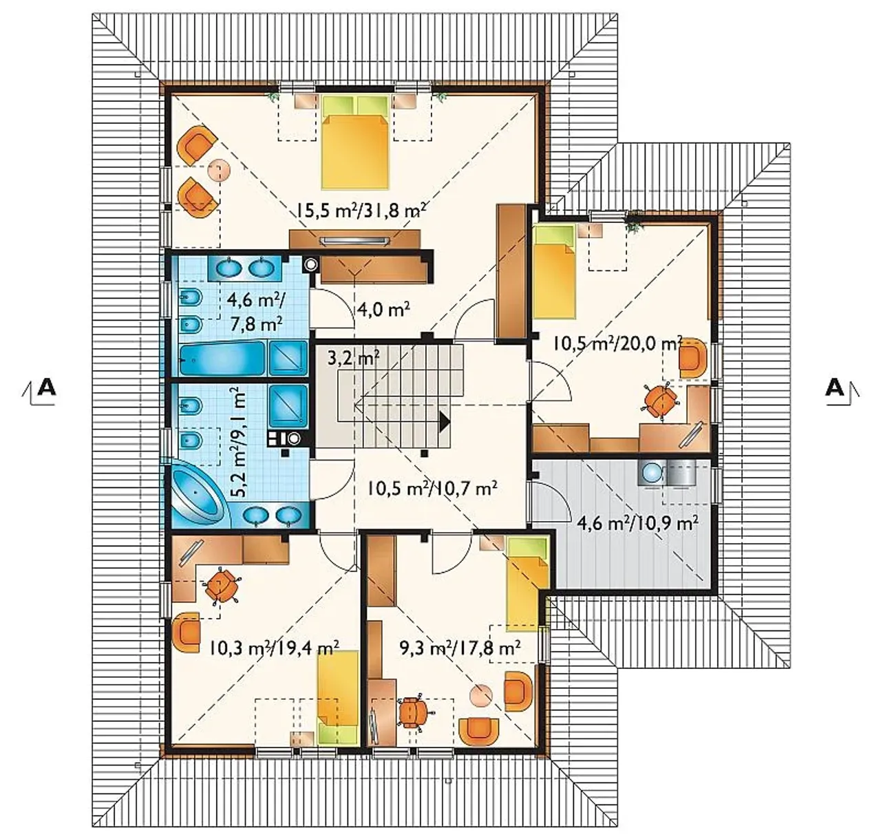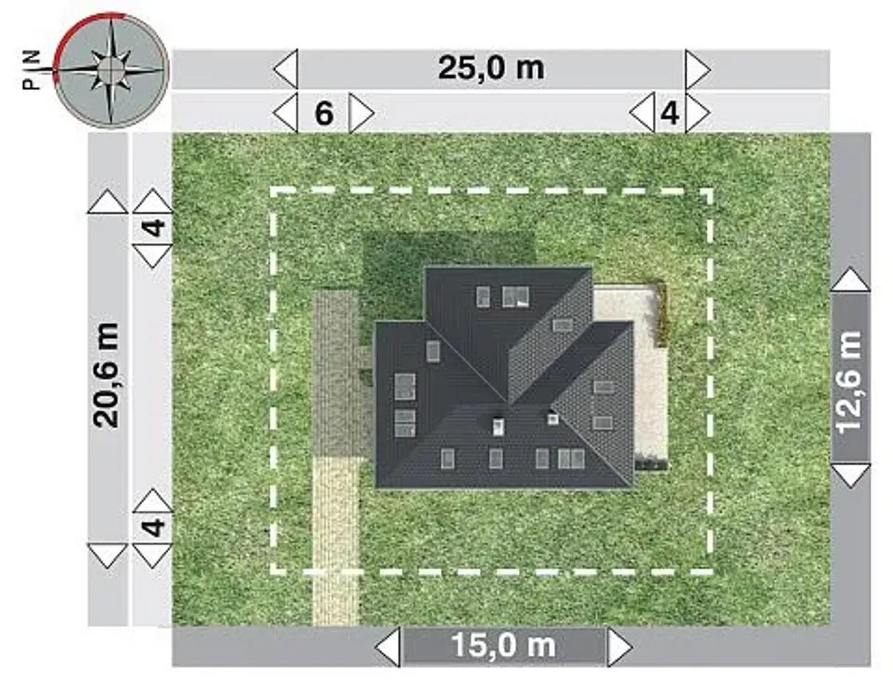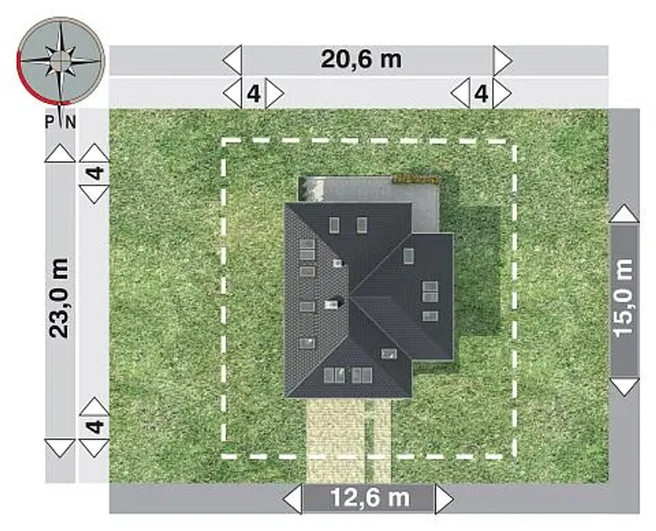 - rzut dachu - ukazuje jego kształt, wymiary, kąt nachylenia połaci, rozmieszczenie okien połaciowych, lukarn, świetlików i rur spustowych, pokazuje rozmieszczenie kominów i informuje o sposobie odwodnienia: rozmieszczeniu i rozmiarach rynien