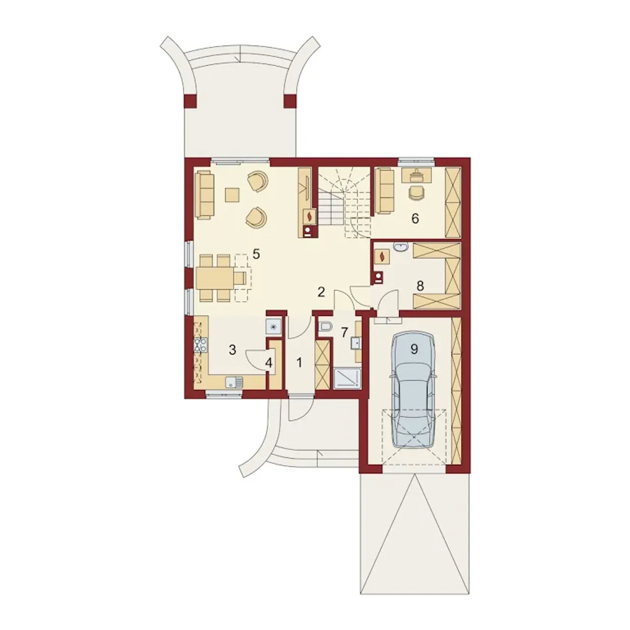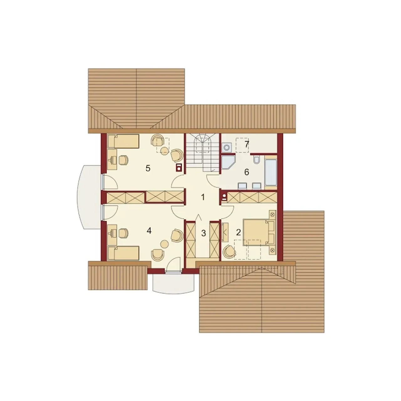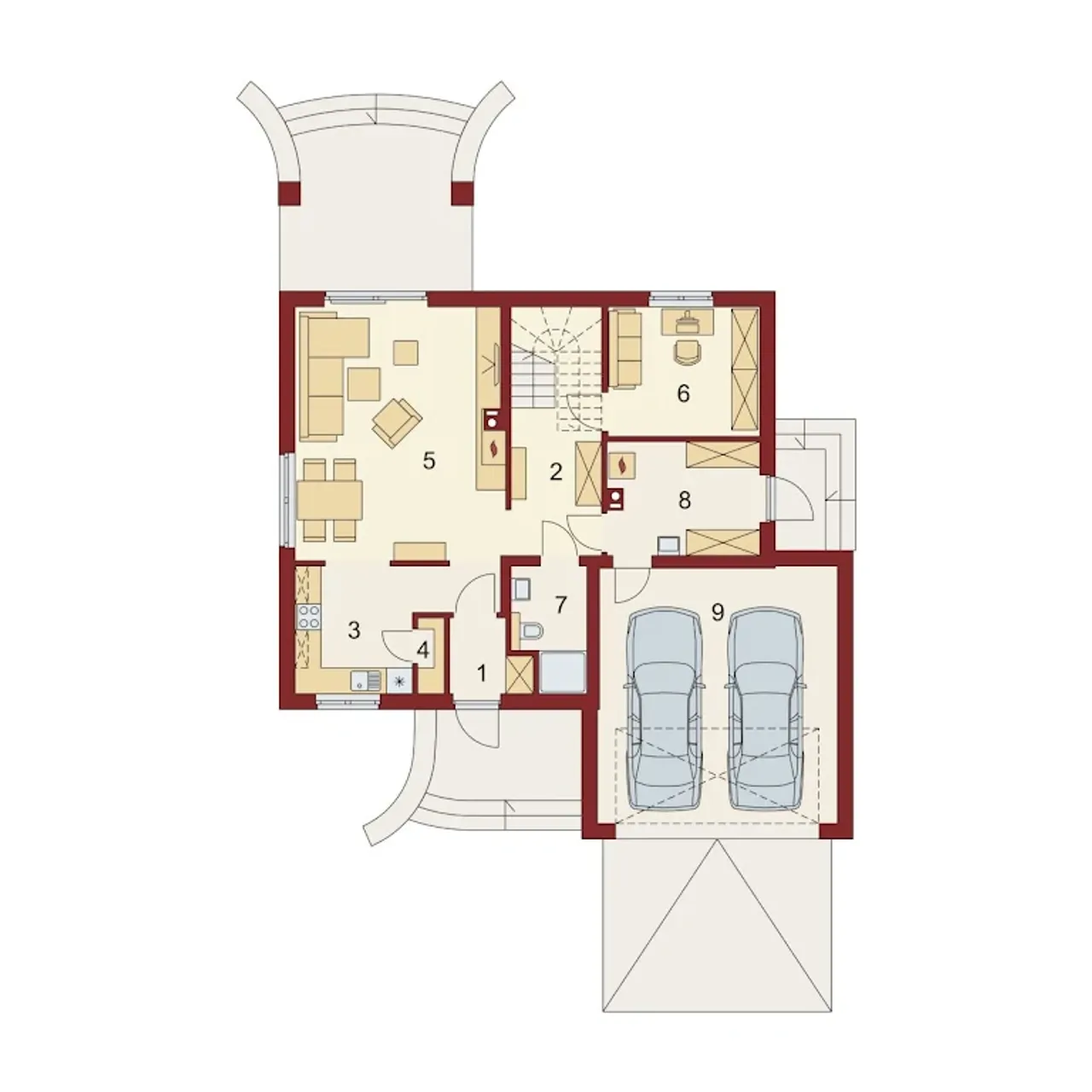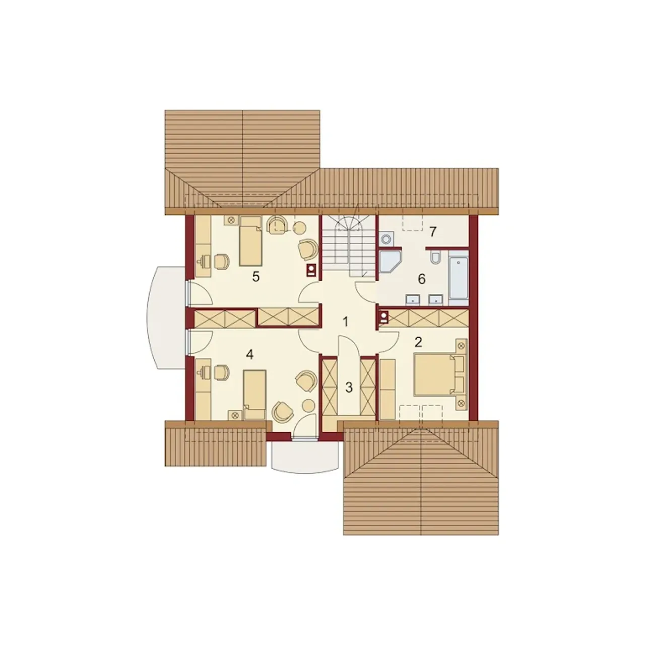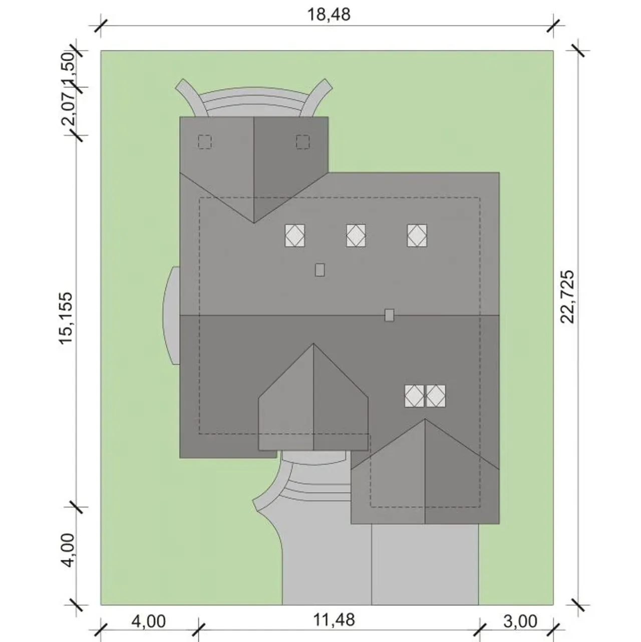 Projekt domu Wera 2 PS to parterowy dom z poddaszem pokryty dachem dwuspadowym, budynek posiada niewielkie gabaryty dzięki czemu inwestycje można realizować również na mniejszych działkach. Od strony frontowej znajdują się zadaszone drzwi frontowe ozdobione niskim murkiem, tuż obok umieszczono wjazd do garażu dwustanowiskowego . W projekcie domu Wera 2 PS znajdziemy jasny salon z jadalnią, z którego mamy dostęp do niezadaszonego tarasu.