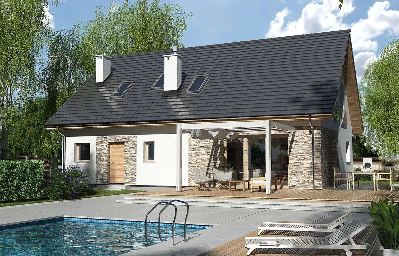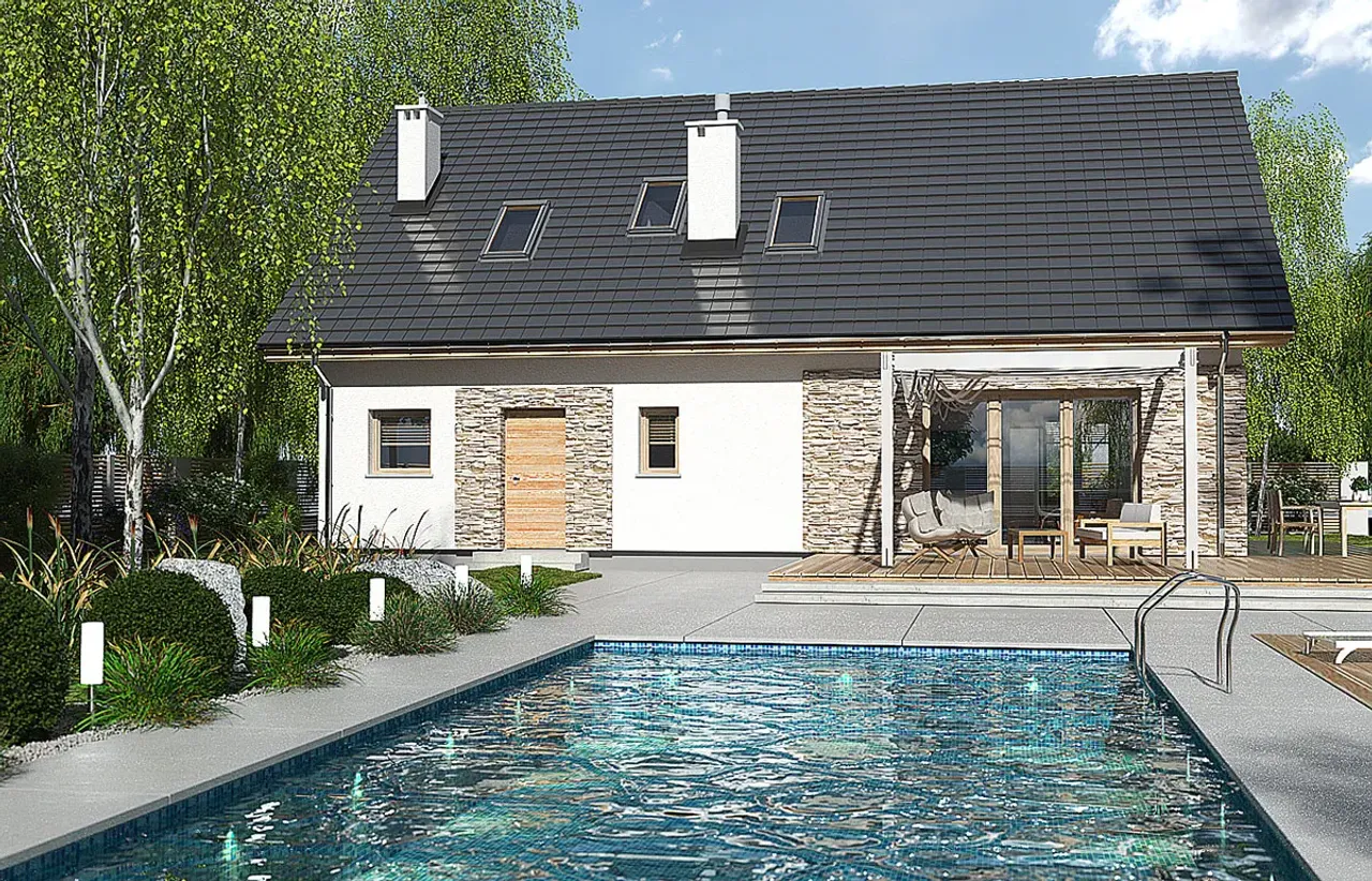 Kupując projekt w technologii murowanej powinieneś budować dom murowany. Zupełna zmiana technologii na szkieletową wymaga przeprojektowania całego budynku ( zmieniają się obciążenia, fundamenty, konstrukcja dachu). Wydamy zgodę na takie przeprojektowanie jednak wiążę się to z dużymi kosztami. Istnieją firmy wykonawcze, które podejmują się zmiany technologii budowy bezpłatnie przy skorzystaniu z ich usług wykonawczych. Zdarza się, że pracownia architektoniczna przygotowuje warianty konkretnego projektu przewidując także inne technologie. Prosimy o sprawdzenie czy istnieje poszukiwana wersja projektu, w zakładce - warianty projektu.