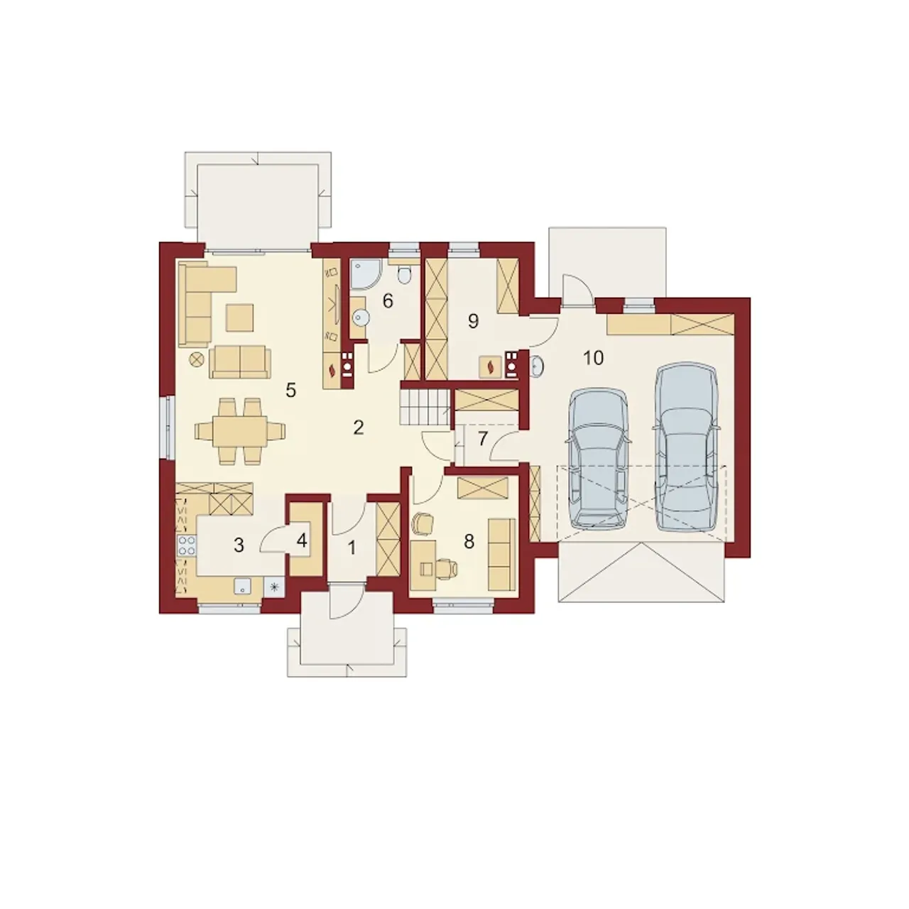 Parter w projekcie WERGILIUSZ 2 PS to przestronna część dzienna składająca się z salonu połączonego z jadalnią. Tuż obok znajduje się otwarta kuchnia, którą w każdej chwili można bezkolizyjnie zamknąć. Reszta parteru podzielona jest pomiędzy spiżarnię, łazienkę oraz dodatkowy pokój. Przeznaczenie pokoju może być dowolne od kolejnej sypialni po gabinet czy domową siłownię. Ponadto na parterze znajduje się przejściowe pomieszczenie gospodarcze prowadzące do dwu-stanowiskowego garażu. Ostatnie pomieszczenie na tej kondygnacji to spora kotłownia.