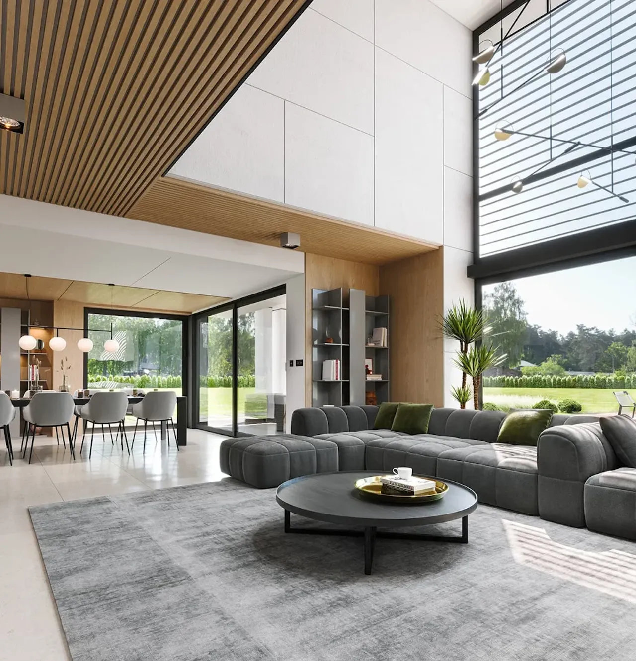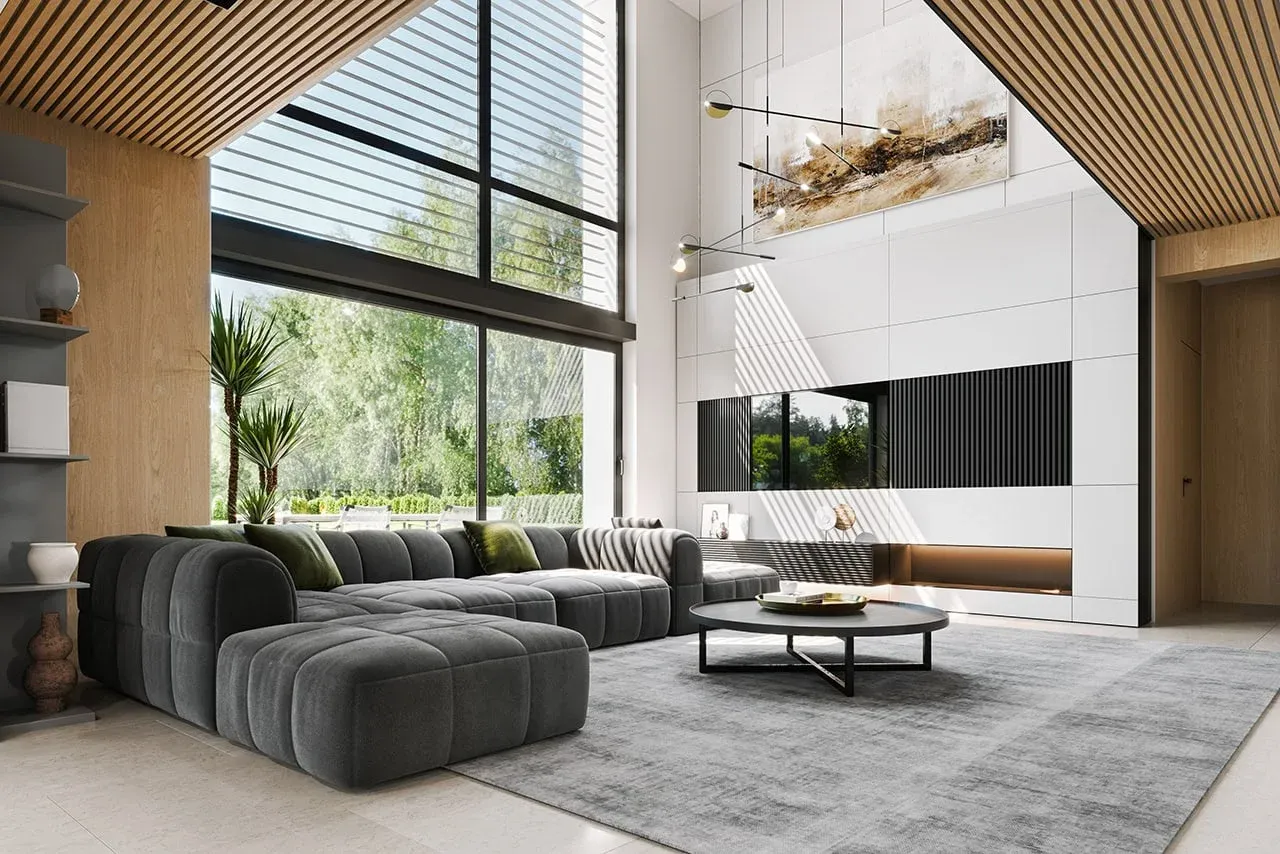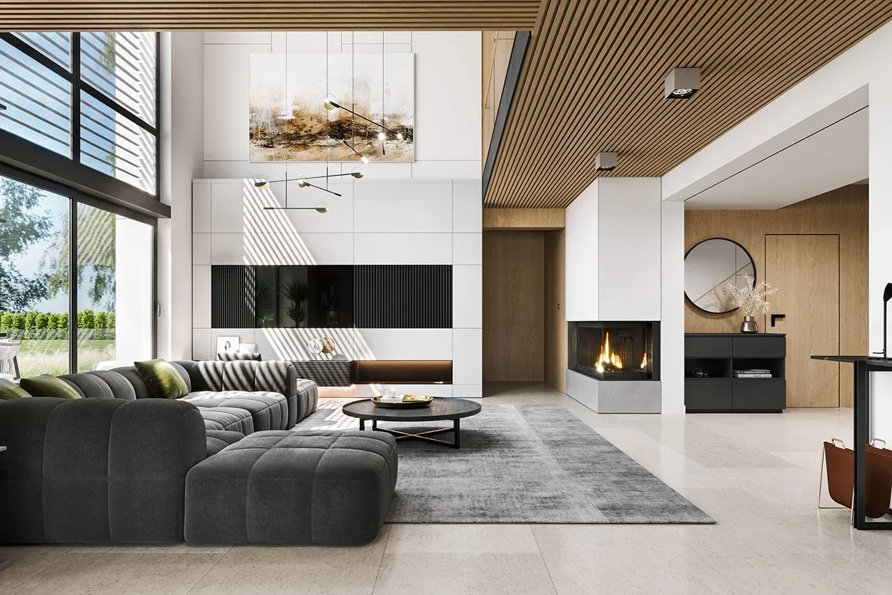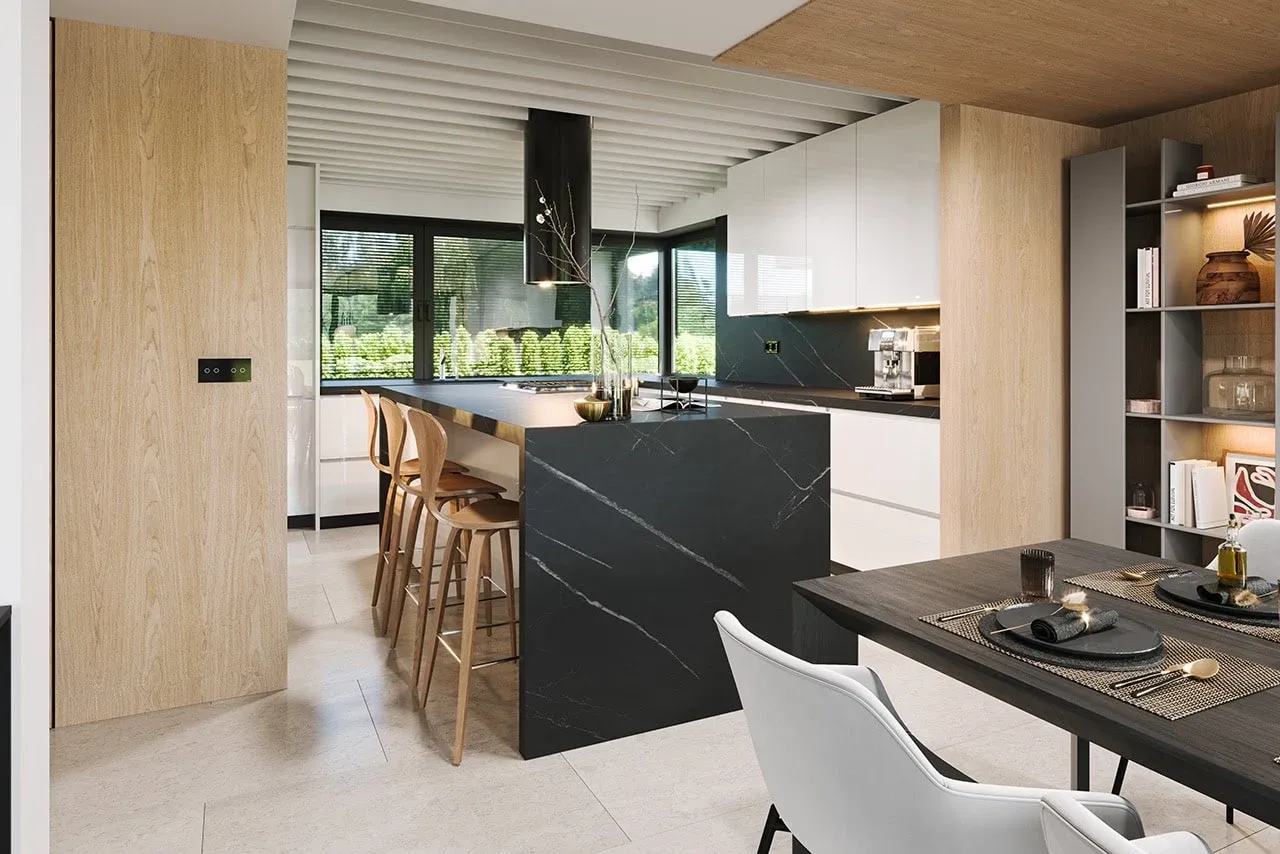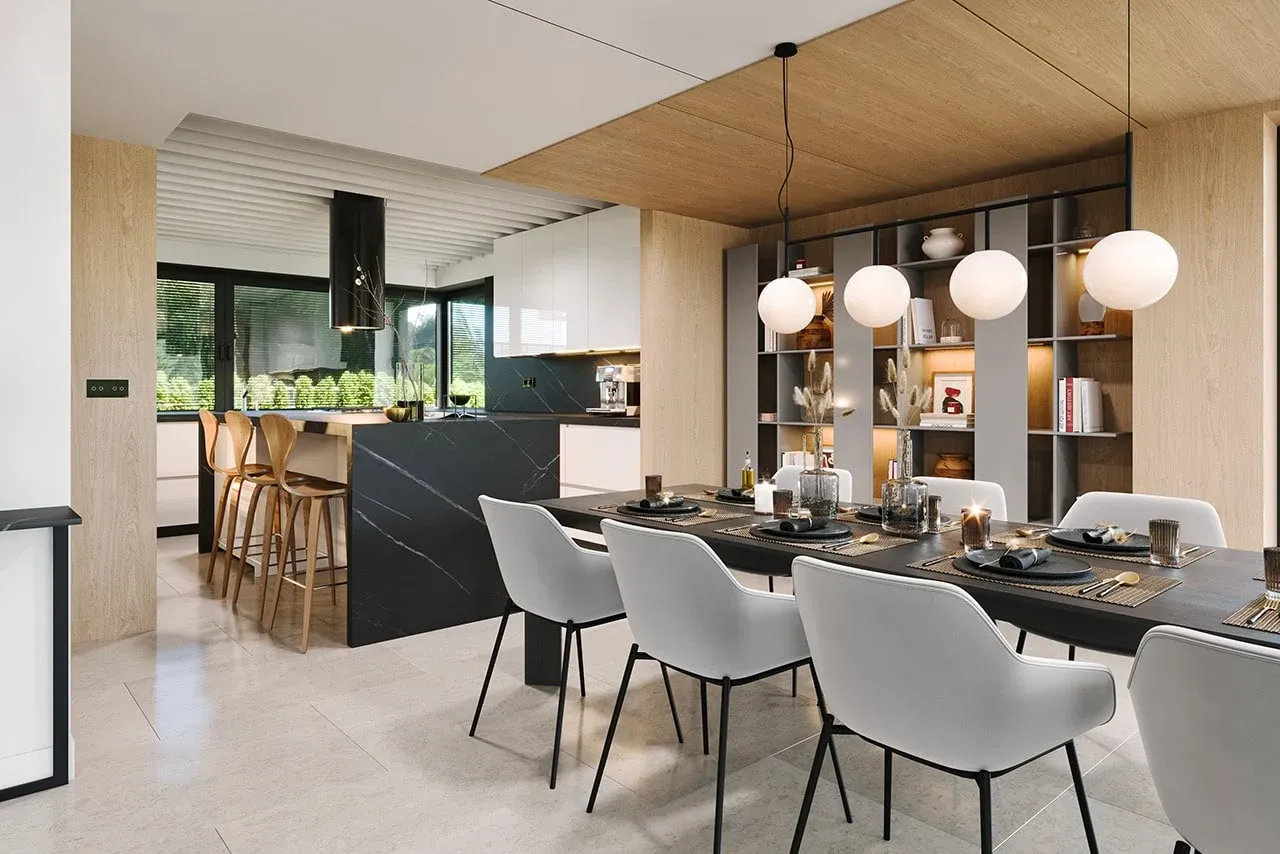 Dom wybudowany w oparciu o tę koncepcję zyskuje także wyjątkową jakość wykonania: solidne fundamenty z betonu, ściany z pustaków Porotherm z warstwą termoizolacyjną oraz elewację z tynku cienkowarstwowego połączonego z elegancką okładziną drewnianą. Dach wielospadowy został pokryty nowoczesną blachą na rąbek o kącie nachylenia 35°, co gwarantuje nie tylko estetykę, ale także trwałość przez lata.