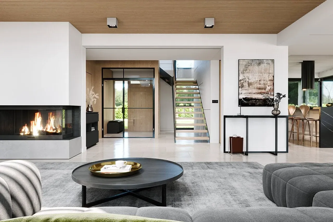 Willa Floryda 7 została zaplanowana z myślą o wygodnej komunikacji. Salon wyposażony w kominek oraz duże przeszklenia z widokiem na taras sprawiają, że wnętrze jest pełne światła. Taras natomiast daje możliwość zorganizowania rodzinnych spotkań na świeżym powietrzu.