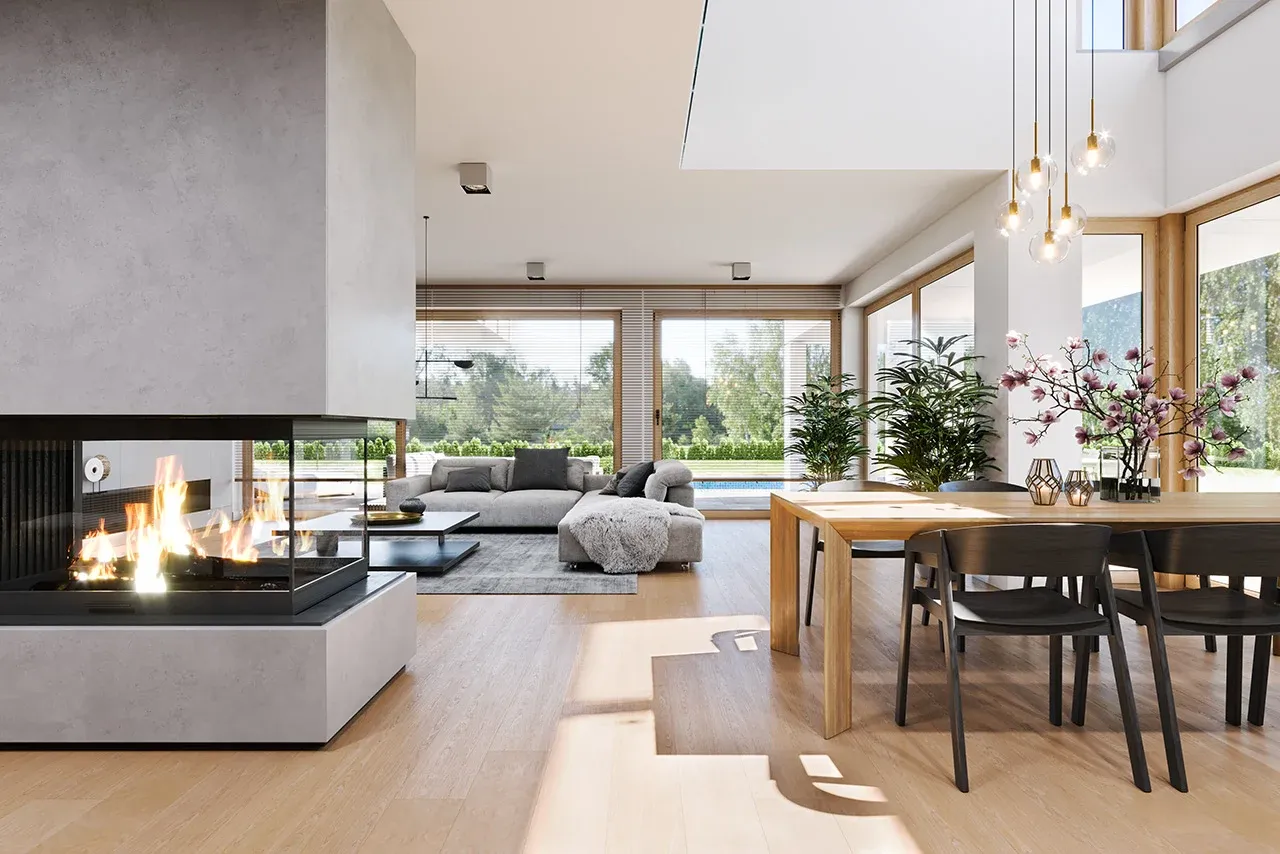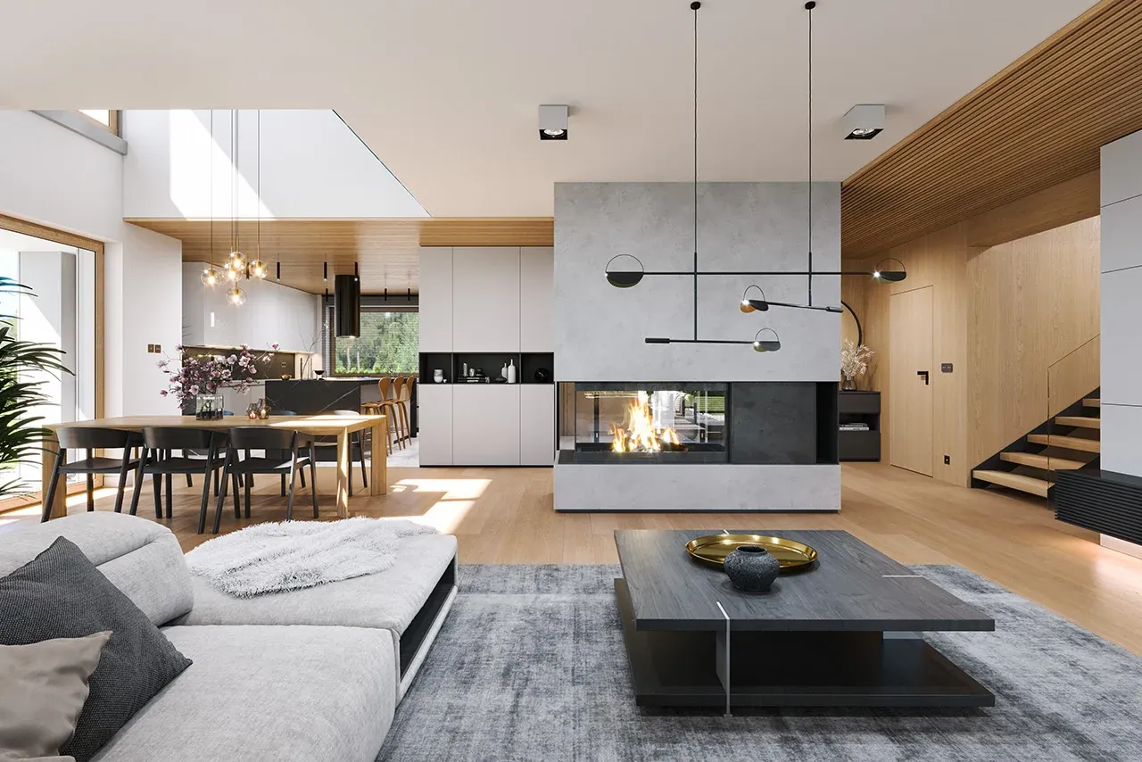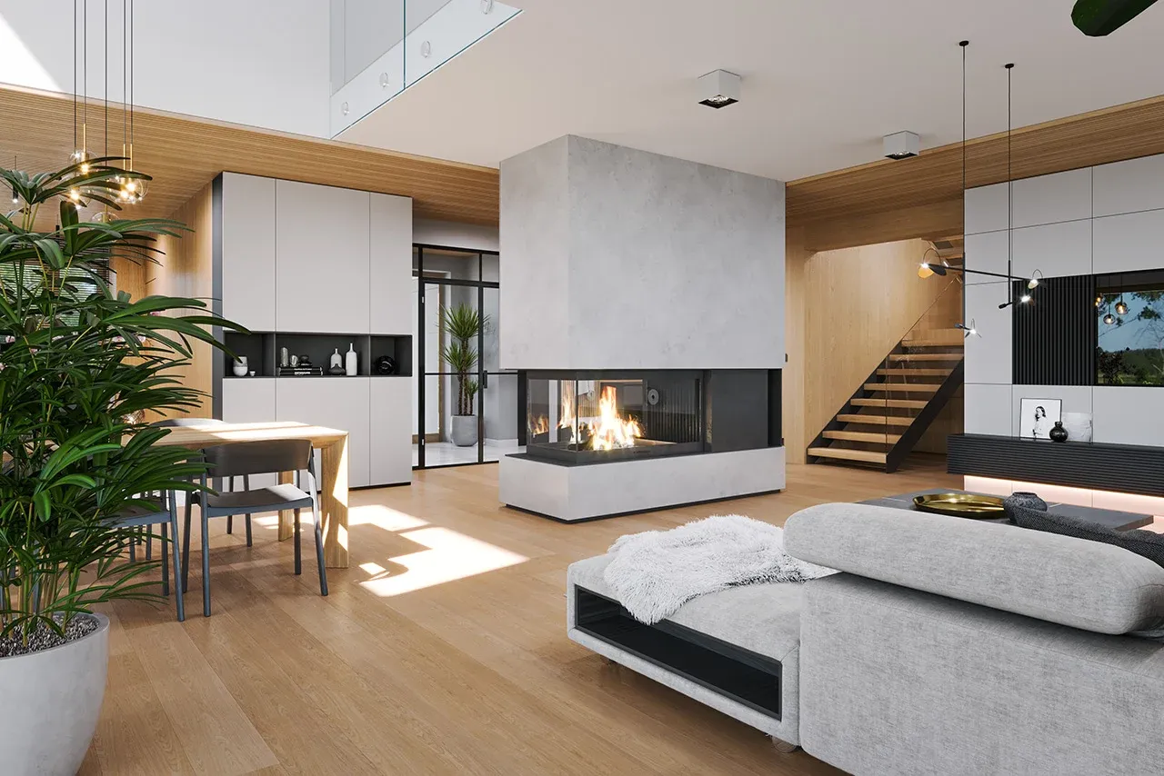 Przemyślany układ sześciu pokoi tworzy strefy do pracy, odpoczynku i wspólnego spędzania czasu. Obecność kominka dodaje wnętrzu ciepła, a ogrzewanie gazowe z rekuperacją otwiera drzwi do oszczędności i świeżego powietrza podczas każdej pory roku.