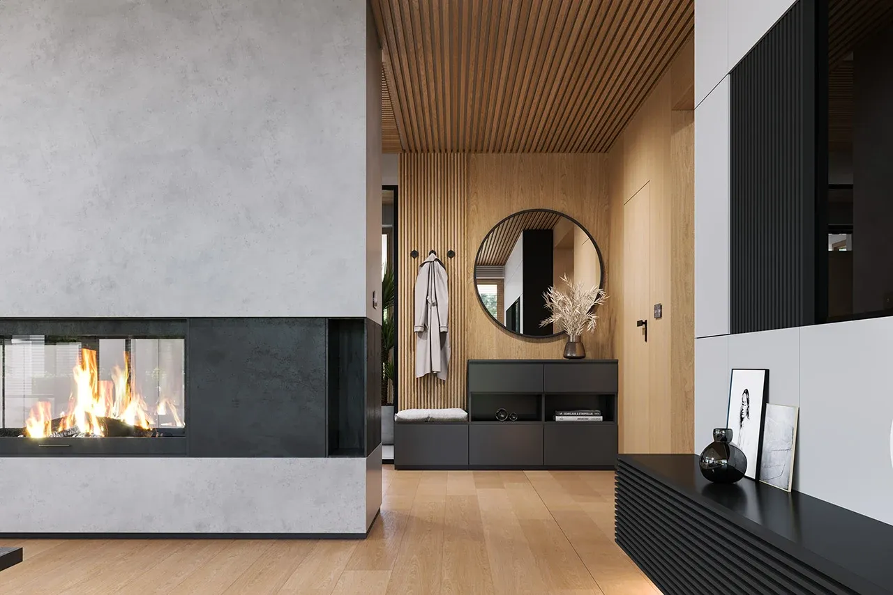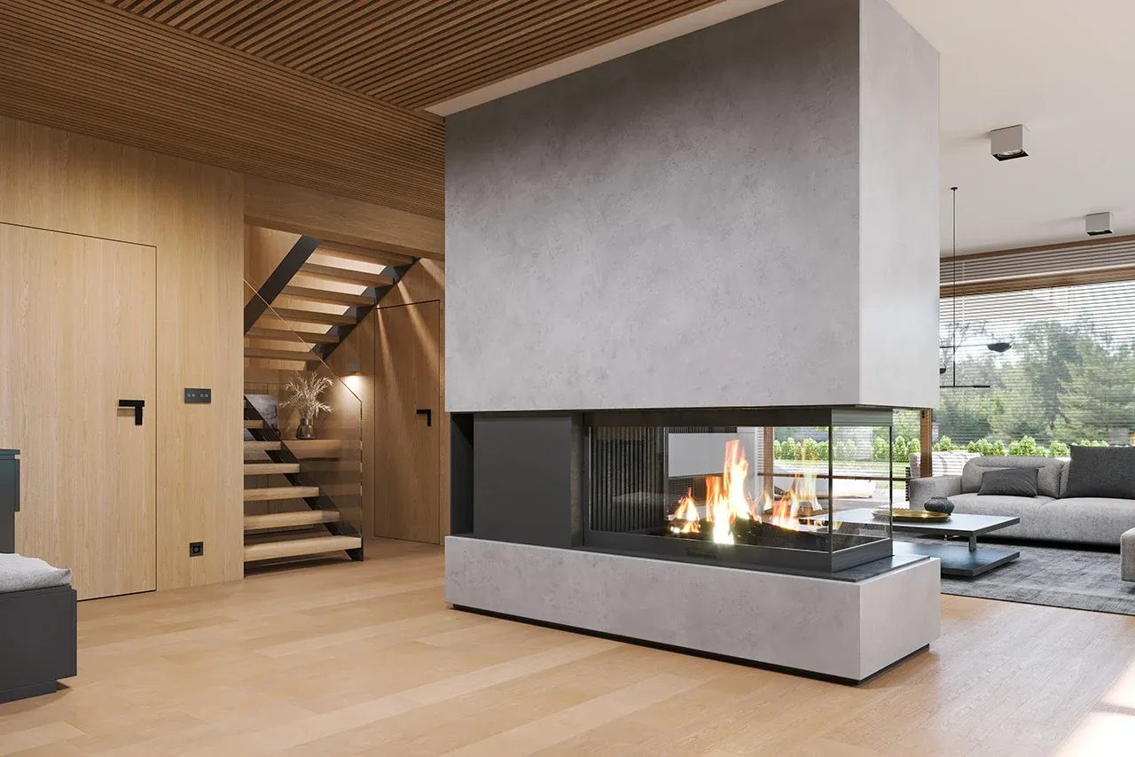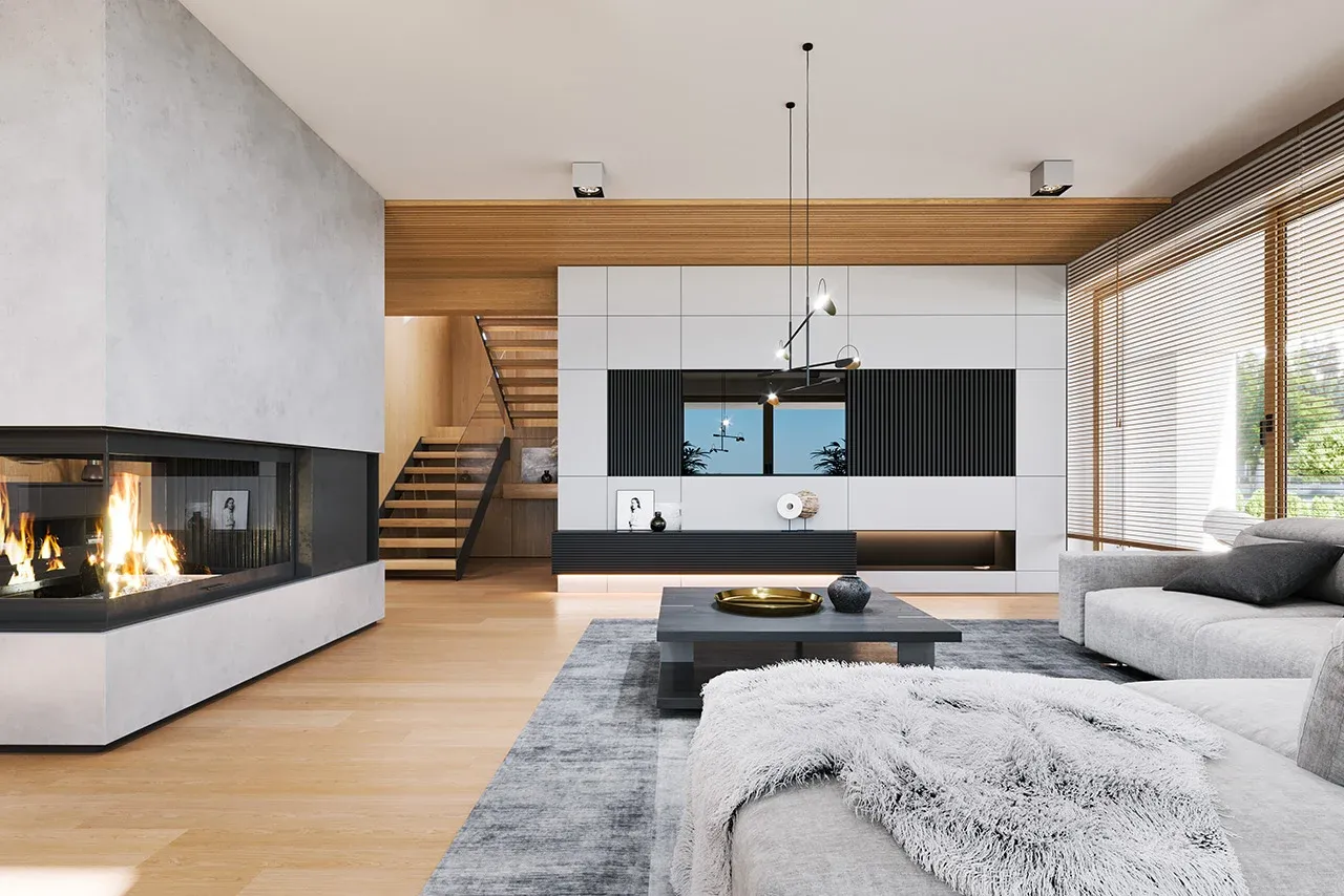 Przemyślany układ sześciu pokoi tworzy strefy do pracy, odpoczynku i wspólnego spędzania czasu. Obecność kominka dodaje wnętrzu ciepła, a ogrzewanie gazowe z rekuperacją otwiera drzwi do oszczędności i świeżego powietrza podczas każdej pory roku.