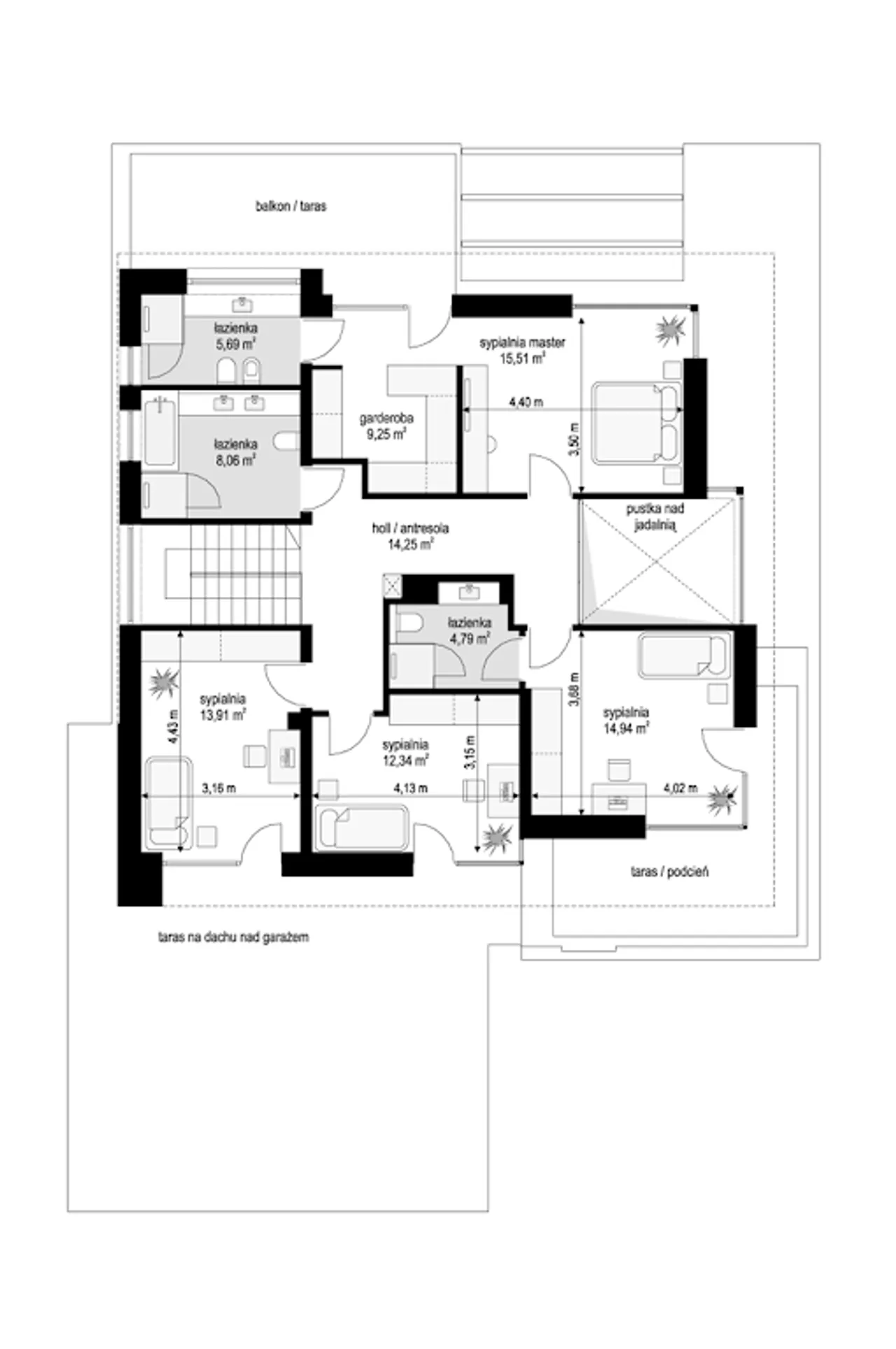 Willa Floryda 8 to połączenie nowoczesnej architektury z funkcjonalnością przestrzeni, stworzone z myślą o wymagających rodzinach. Dom piętrowy, wyposażony w praktyczny, zadaszony taras oraz przestronny, dwustanowiskowy garaż, daje wygodę użytkowania na lata. Ten projekt domu jednorodzinnego to idealny wybór dla osób ceniących niebanalną stylistykę i nowoczesne technologie budowlane.