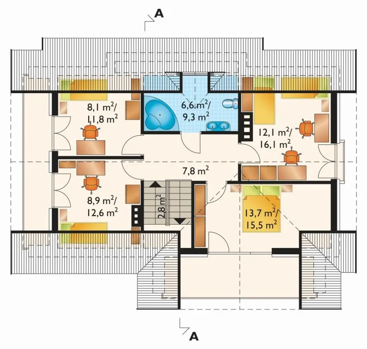 - rzut dachu - ukazuje jego kształt, wymiary, kąt nachylenia połaci, rozmieszczenie okien połaciowych, lukarn, świetlików i rur spustowych, pokazuje rozmieszczenie kominów i informuje o sposobie odwodnienia: rozmieszczeniu i rozmiarach rynien