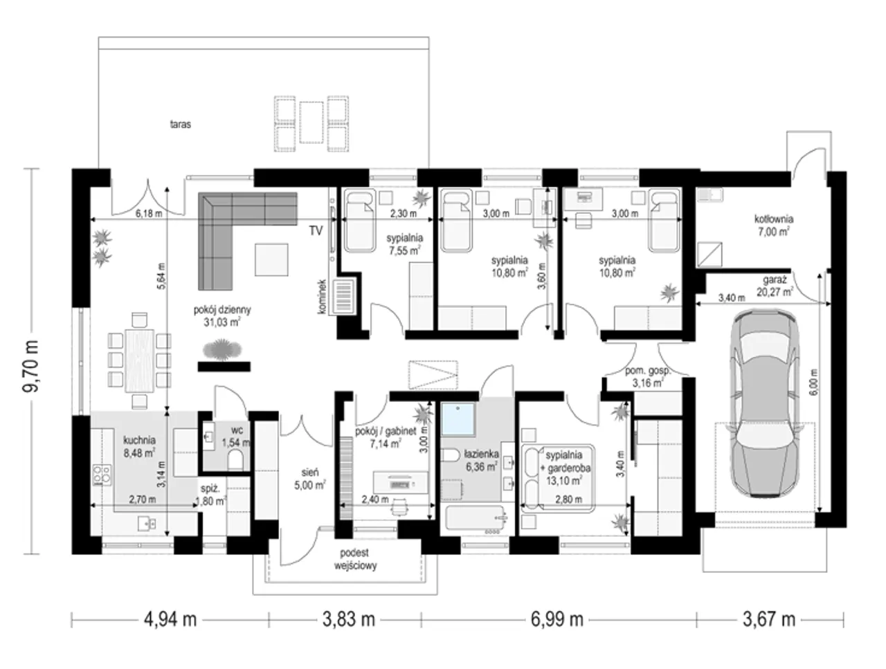 Wypełnij formularz i otrzymaj rysunki w pdf z dokładnymi wymiarami budynku i pomieszczeń (długość, szerokość, wysokość) dla projektu Wymarzony 10