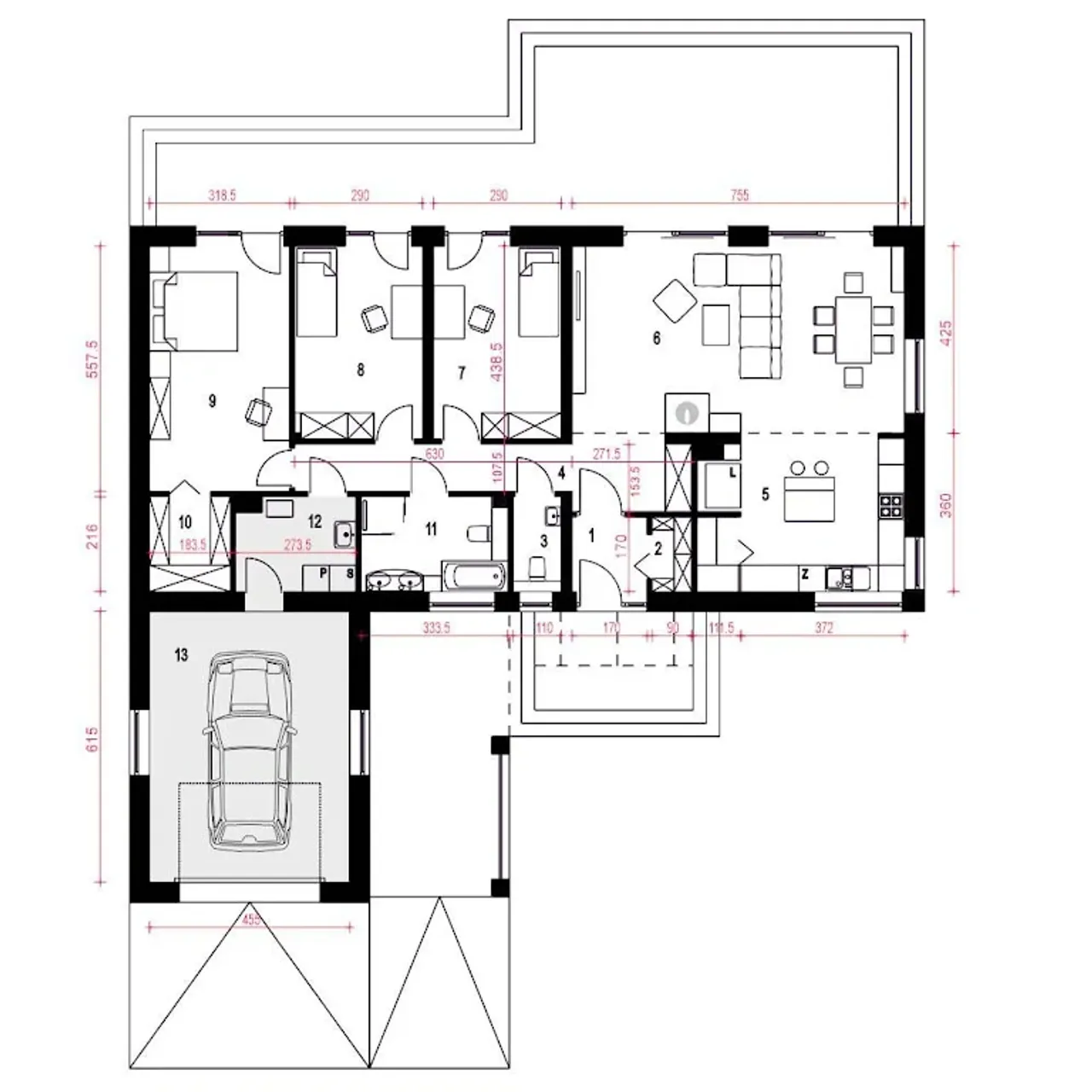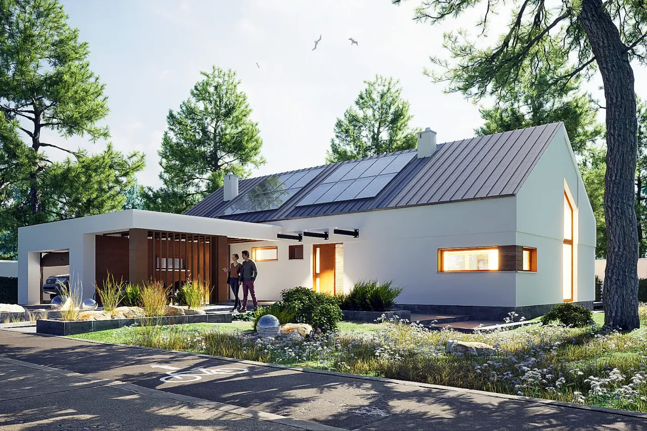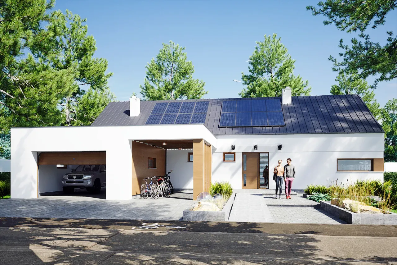 Wypełnij formularz i otrzymaj rysunki w pdf z dokładnymi wymiarami budynku i pomieszczeń (długość, szerokość, wysokość) dla projektu Złota II z garażem i wiatą A