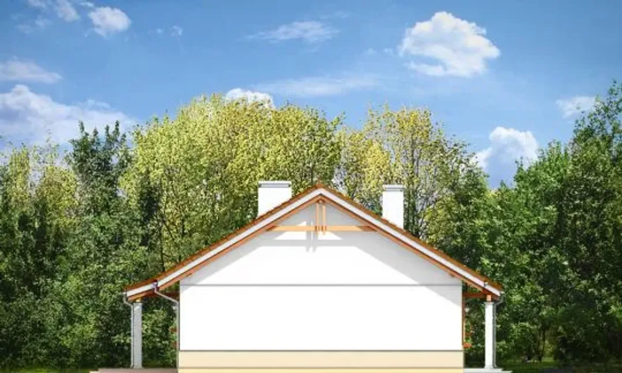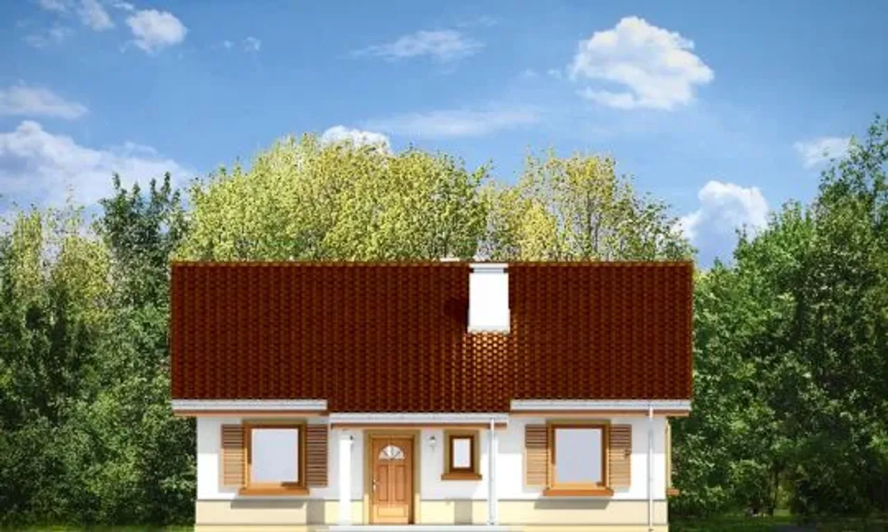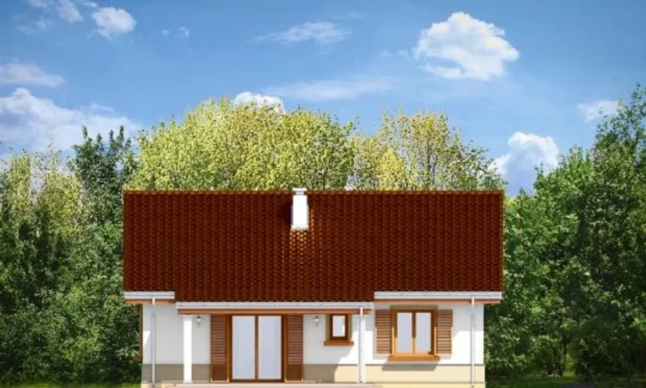 Projekt domu Żabka to dom jednorodzinny parterowy dla 3-5cioosobowej rodziny o tradycyjnym wyglądzie. Frontową elewację zdobi ganek wejściowy, a od strony ogrodu - zadaszenie tarasu. Okna z okiennicami, opaski i cokoły - wszystkie te elementy ciekawie urozmaicają wygląd zewnętrzny. Jest to budynek parterowy przykryty dwuspadowym dachem, niepodpiwniczony, bez garażu. Powierzchnia użytkowa: 79,31 m2. Budynek może być posadowiony na działce od 350 m2. Projekt przewiduje ogrzewanie wodne zasilane piecem gazowym zainstalowanym w kotłowni przy wejściu do budynku. Dodatkowo można uzyskać ogrzewanie na bazie kominka. Parter gotowego projektu domu Żabka to pokój dzienny z aneksem jadalnym, z kominkiem od strony jadalni, doświetlony dwuskrzydłowym wyjściem na częściowo zadaszony taras oraz otwarta kuchnia. Ponadto na parterze znajdują się dwie sypialnie, łazienka i WC. Charakterystyka Energetyczna dla tego projektu jest zgodna z aktualnie obowiązującymi przepisami prawa budowlanego.