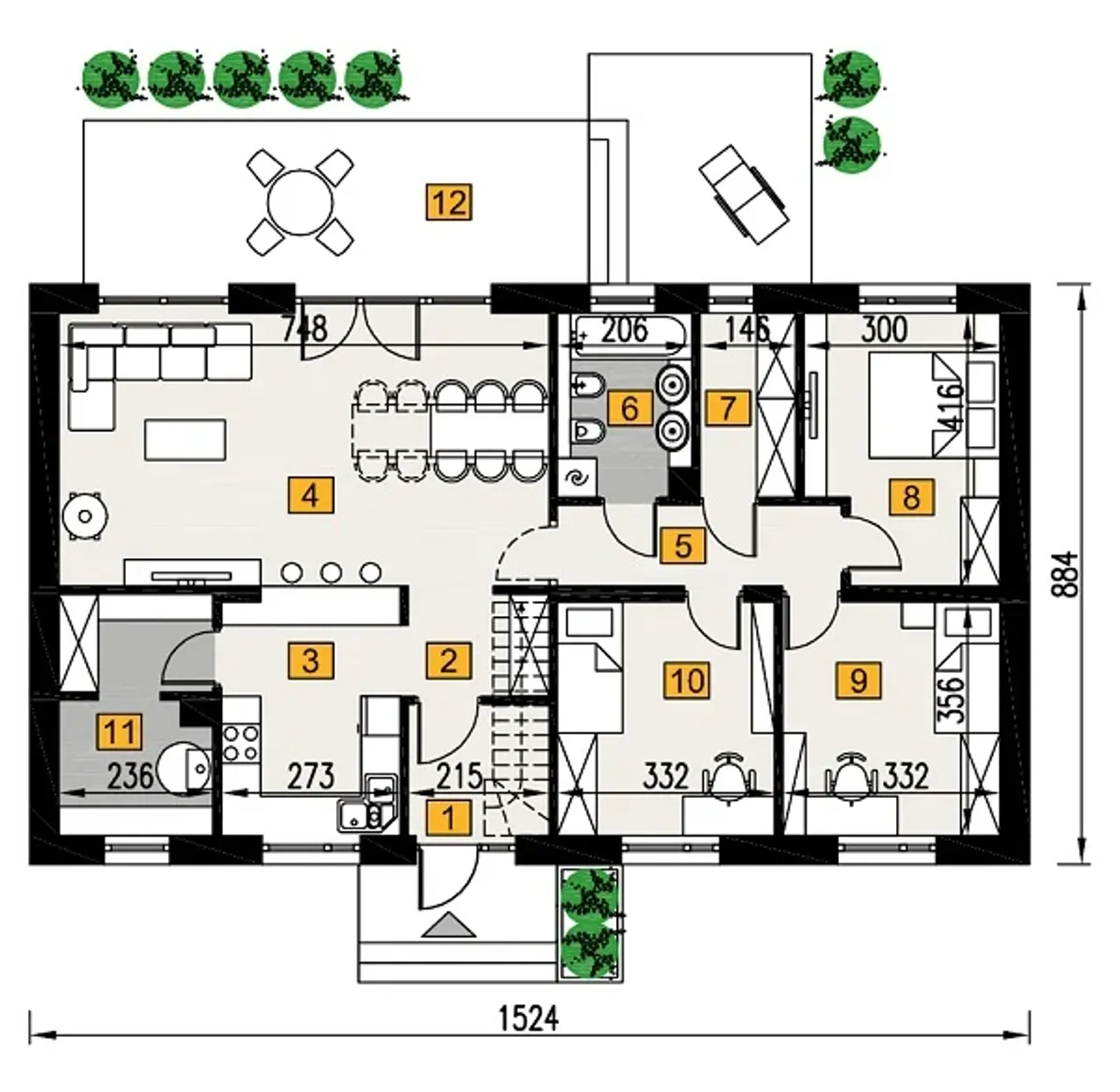 Wypełnij formularz i otrzymaj rysunki w pdf z dokładnymi wymiarami budynku i pomieszczeń (długość, szerokość, wysokość) dla projektu Zaufany N - wariant I (aranżacja 3) - A106aN+AR3