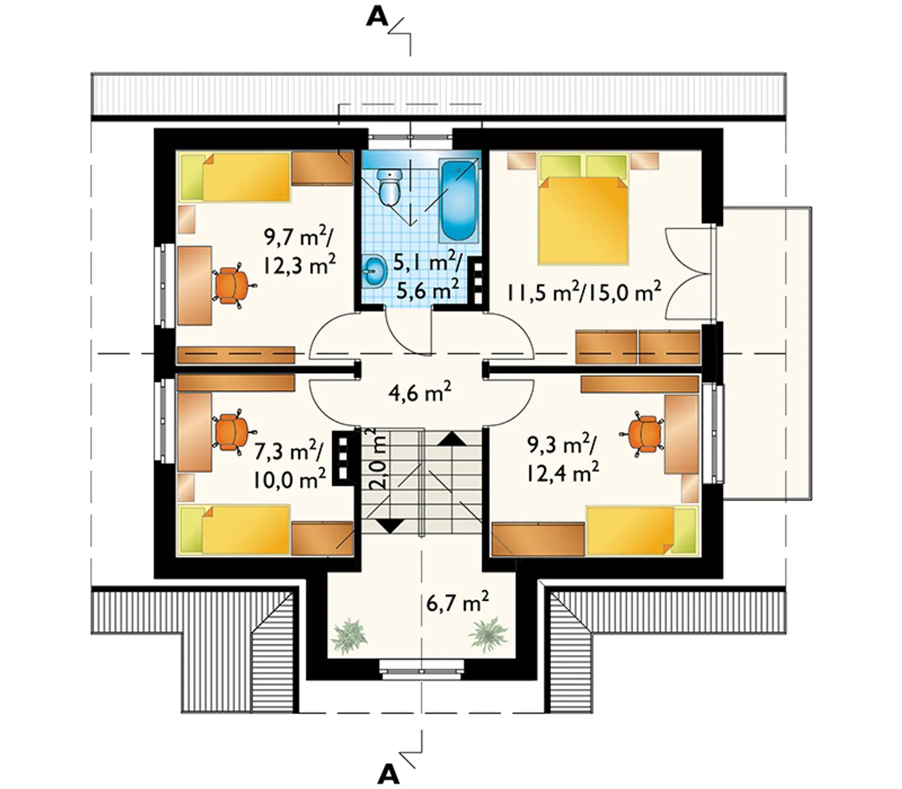 - rzut dachu - ukazuje jego kształt, wymiary, kąt nachylenia połaci, rozmieszczenie okien połaciowych, lukarn, świetlików i rur spustowych, pokazuje rozmieszczenie kominów i informuje o sposobie odwodnienia: rozmieszczeniu i rozmiarach rynien