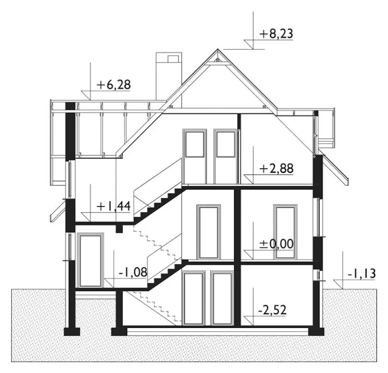 - przekroje - pokazują wszystkie elementy budynku po przecięciu go wzdłuż lub w poprzek od dachu do fundamentów tj. warstwy podłogi, stropów i dachu