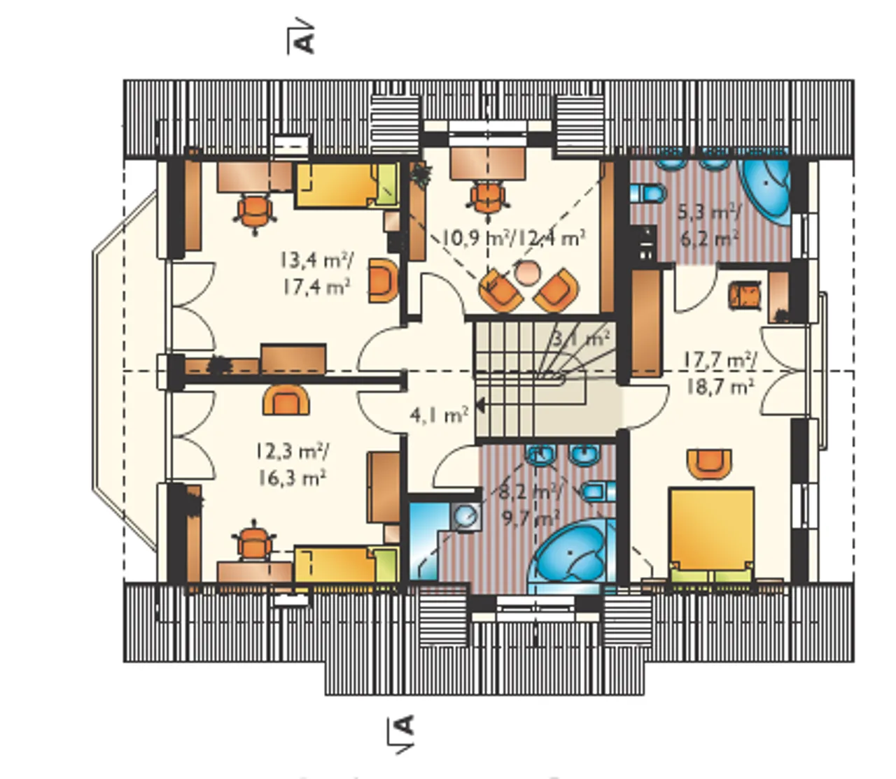 - rzuty wszystkich kondygnacji- pokazuje rozmieszczenie poszczególnych pomieszczeń i ich wymiary, powierzchnie, rozmieszczenie ścian, rozmieszczenie otworów drzwiowych, okiennych, urządzeń kuchennych i sanitarnych