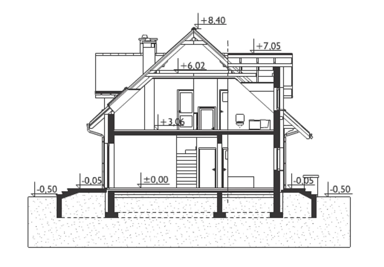 - przekroje - pokazują wszystkie elementy budynku po przecięciu go wzdłuż lub w poprzek od dachu do fundamentów tj. warstwy podłogi, stropów i dachu