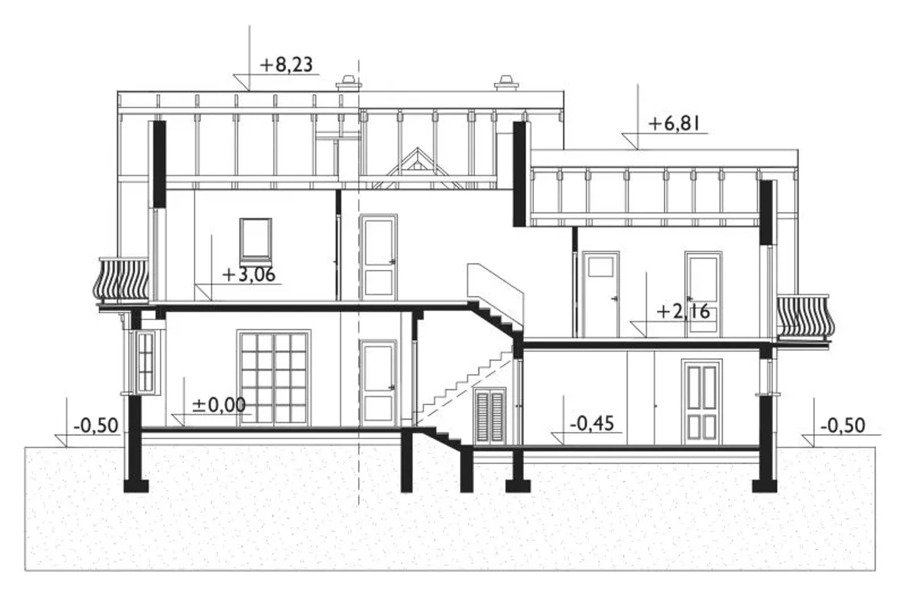- przekroje - pokazują wszystkie elementy budynku po przecięciu go wzdłuż lub w poprzek od dachu do fundamentów tj. warstwy podłogi, stropów i dachu