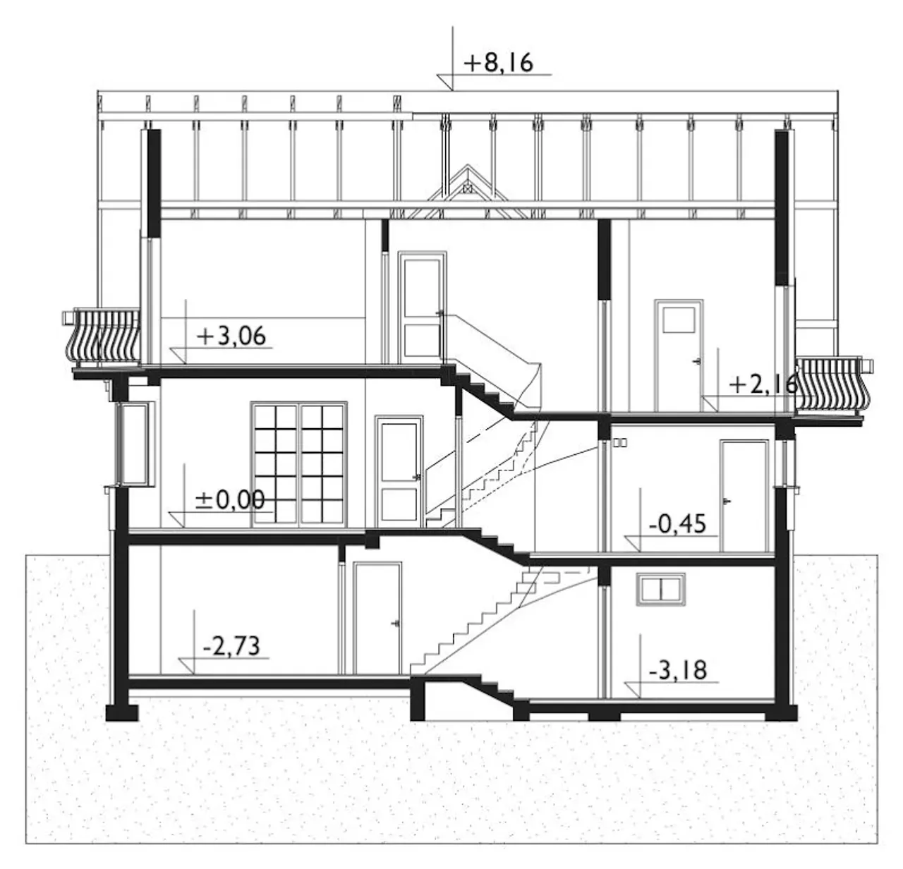 - przekroje - pokazują wszystkie elementy budynku po przecięciu go wzdłuż lub w poprzek od dachu do fundamentów tj. warstwy podłogi, stropów i dachu