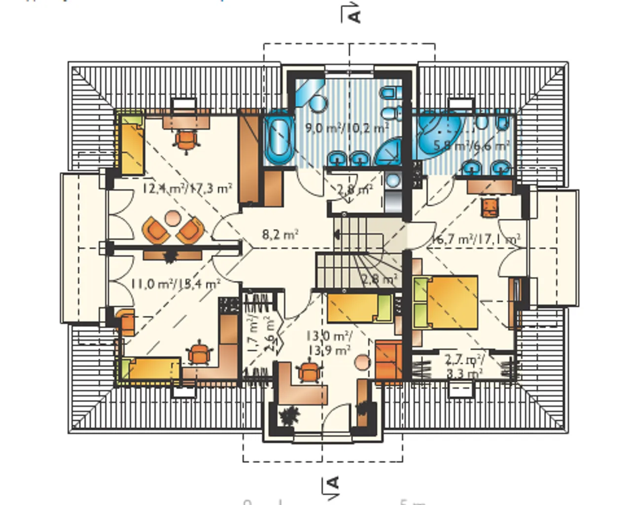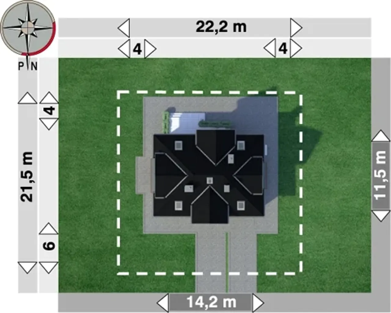 - rzut dachu - ukazuje jego kształt, wymiary, kąt nachylenia połaci, rozmieszczenie okien połaciowych, lukarn, świetlików i rur spustowych, pokazuje rozmieszczenie kominów i informuje o sposobie odwodnienia: rozmieszczeniu i rozmiarach rynien