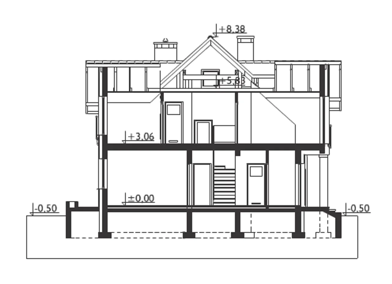 - przekroje - pokazują wszystkie elementy budynku po przecięciu go wzdłuż lub w poprzek od dachu do fundamentów tj. warstwy podłogi, stropów i dachu