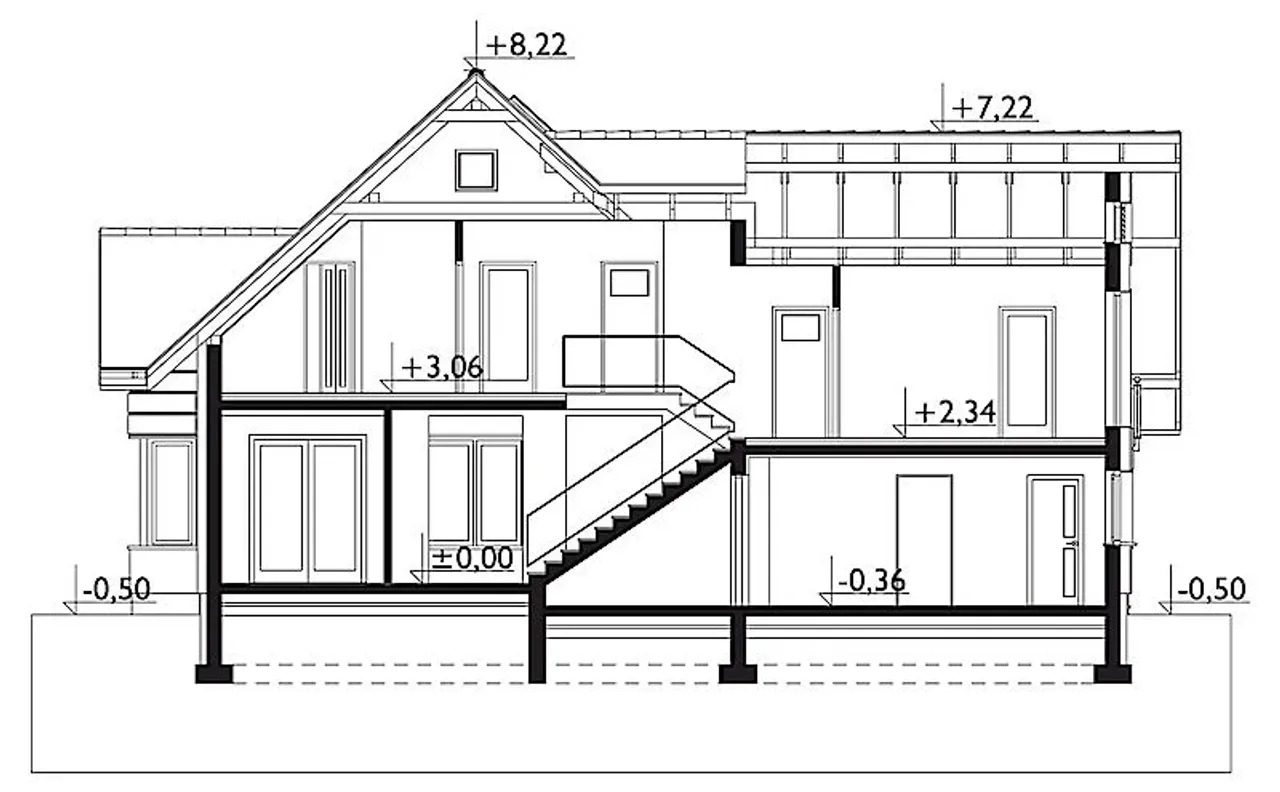 - przekroje - pokazują wszystkie elementy budynku po przecięciu go wzdłuż lub w poprzek od dachu do fundamentów tj. warstwy podłogi, stropów i dachu