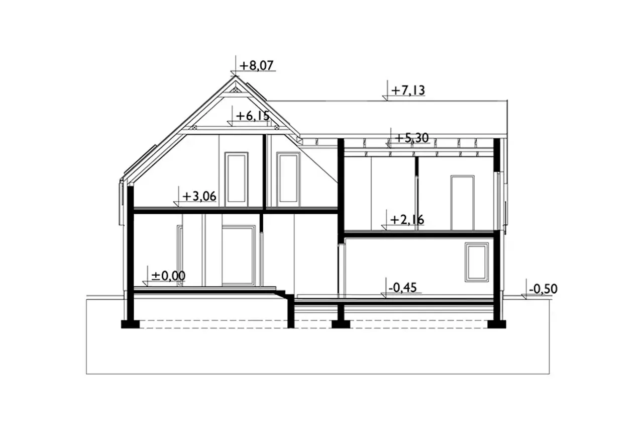 - przekroje - pokazują wszystkie elementy budynku po przecięciu go wzdłuż lub w poprzek od dachu do fundamentów tj. warstwy podłogi, stropów i dachu